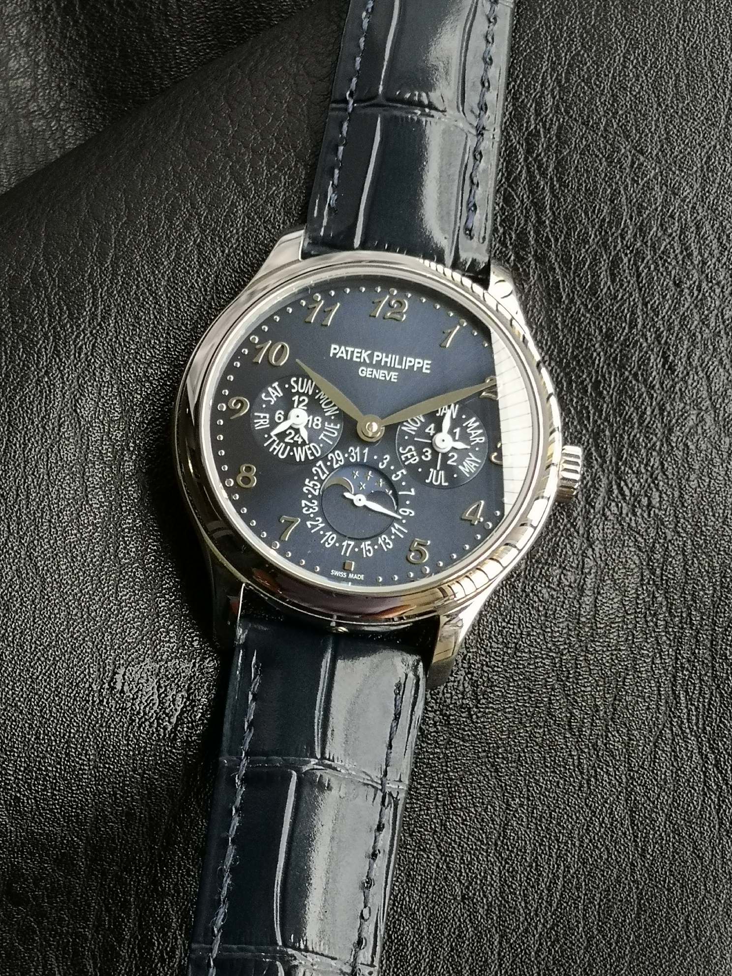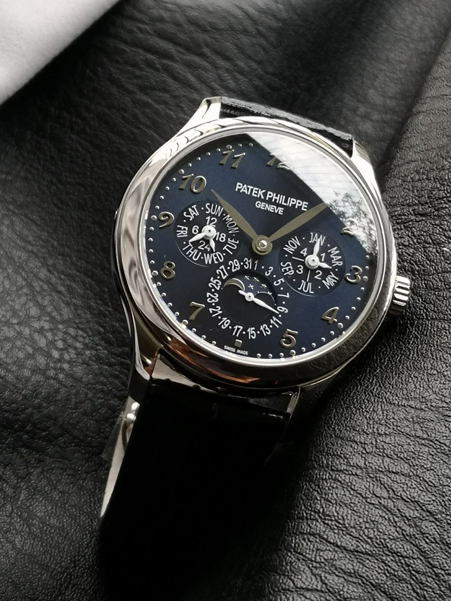 with a 40mm case diameter and a dial layout that is both elegant and refined. Despite its numerous functions, the design never feels cluttered; the sunburst finish, paired with three-dimensional gold Breguet numerals and leaf-shaped hour markers, creates a striking and sophisticated aesthetic.