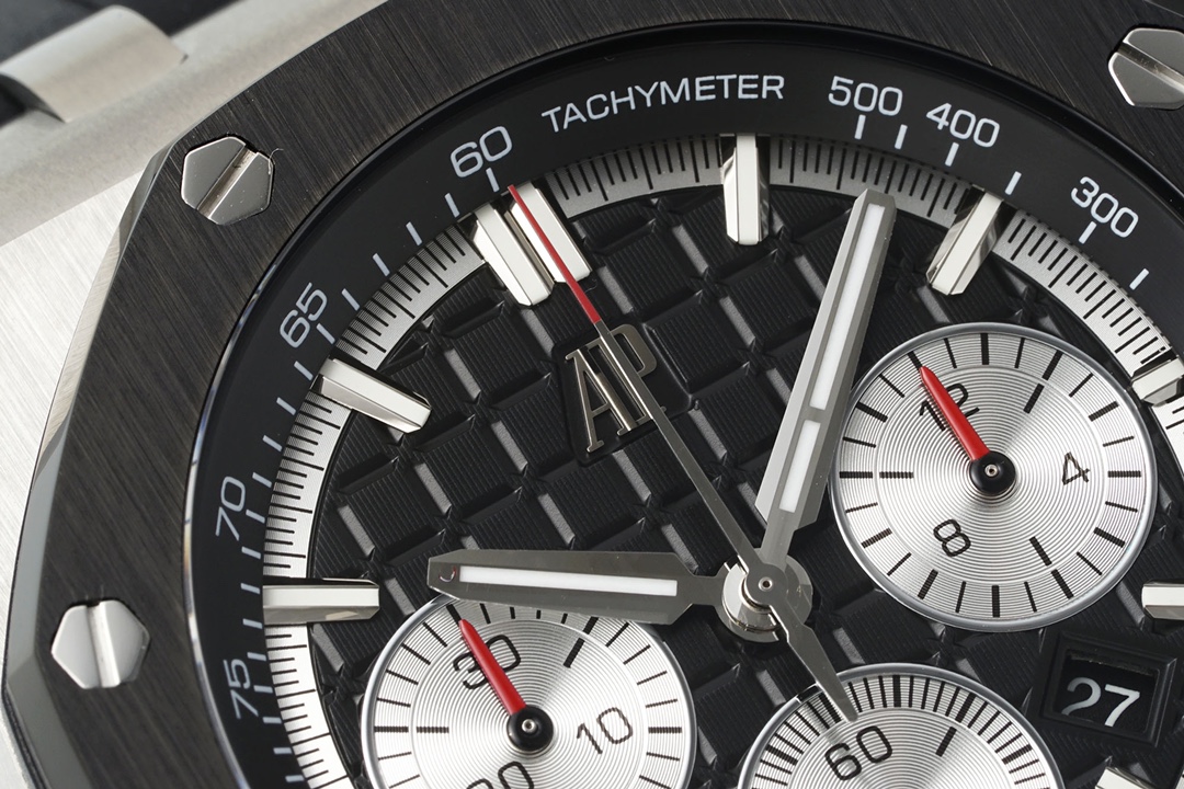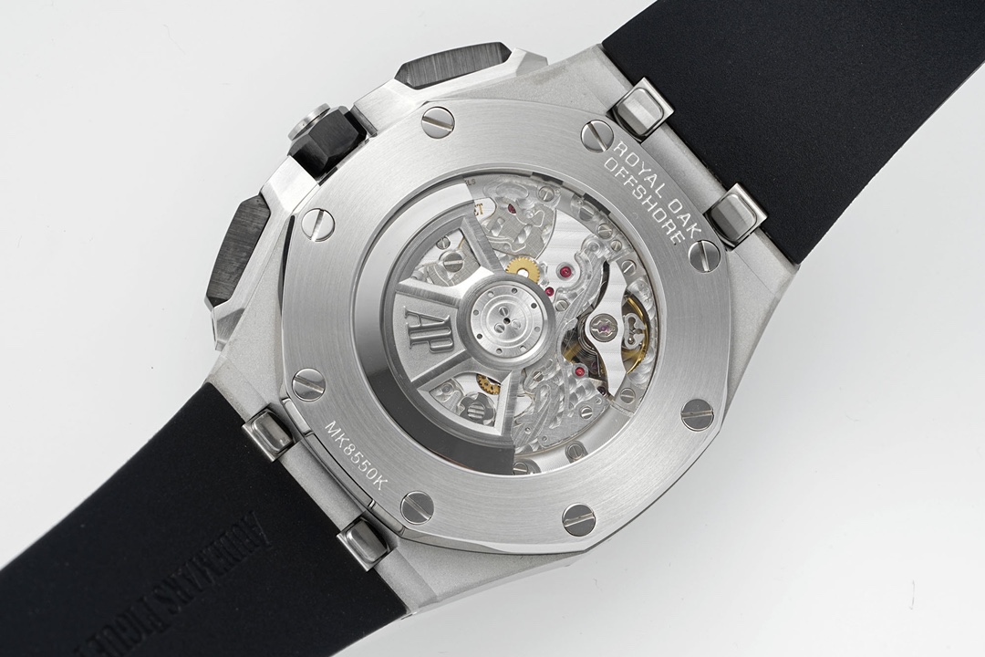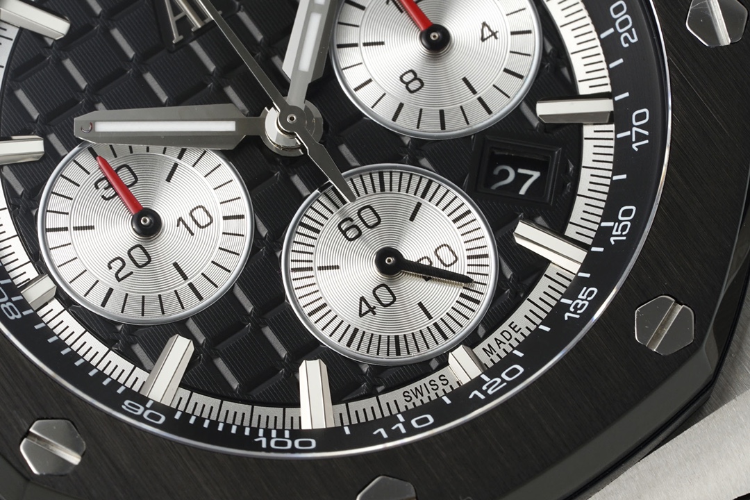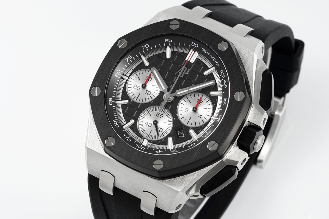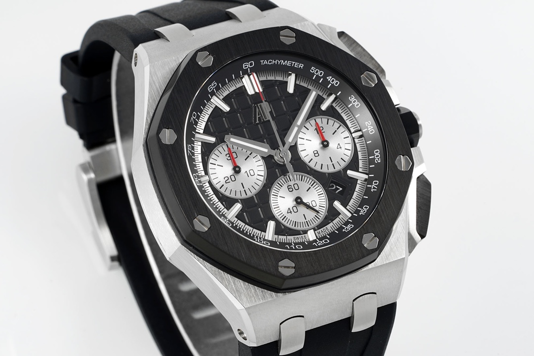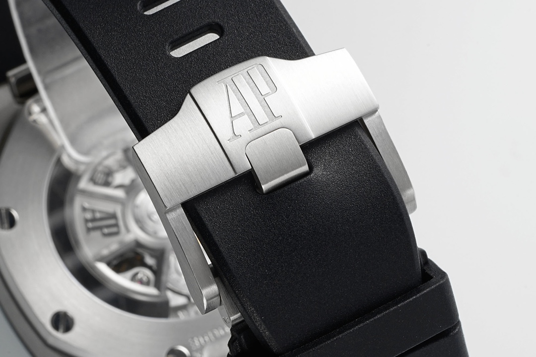 Exclusively developed by Apf Factory: Audemars Piguet Royal Oak Offshore 26420, Crafted using a 1:1 scale of the genuine model, the entire watch employs the latest German CNC technology, with every detail matching the original. The strap and clasp utilize the same quick-release technology as the genuine model, allowing for seamless interchangeability. The dial features the latest horizontal and vertical checkered pattern, exuding a bold and luxurious presence when worn. The movement uses the top-tier Dandong caliber, meticulously replicating the appearance of the genuine Caliber 4401, making it virtually indistinguishable from the original on both the front and back. First batch quantities are limited; available on a first-come, first-served basis. The first batch colors are: 1. Rose Gold “Panda Eye”; 2. The hottest Desert Yellow Smoked Dial; 3. Classic Blue Dial with White “Panda Eyes”; 4. Gray Dial with Blue “Panda Eyes”; 5. Classic and Versatile White “Panda Eye”.