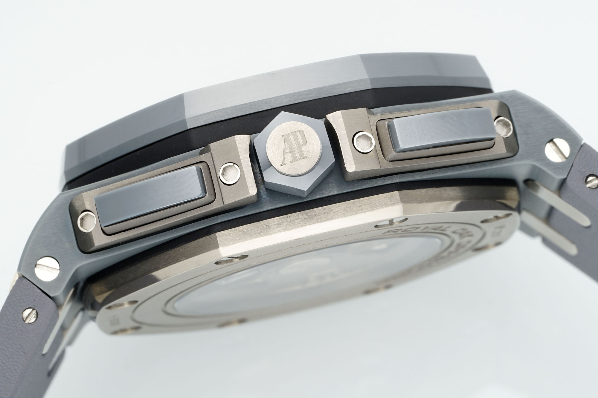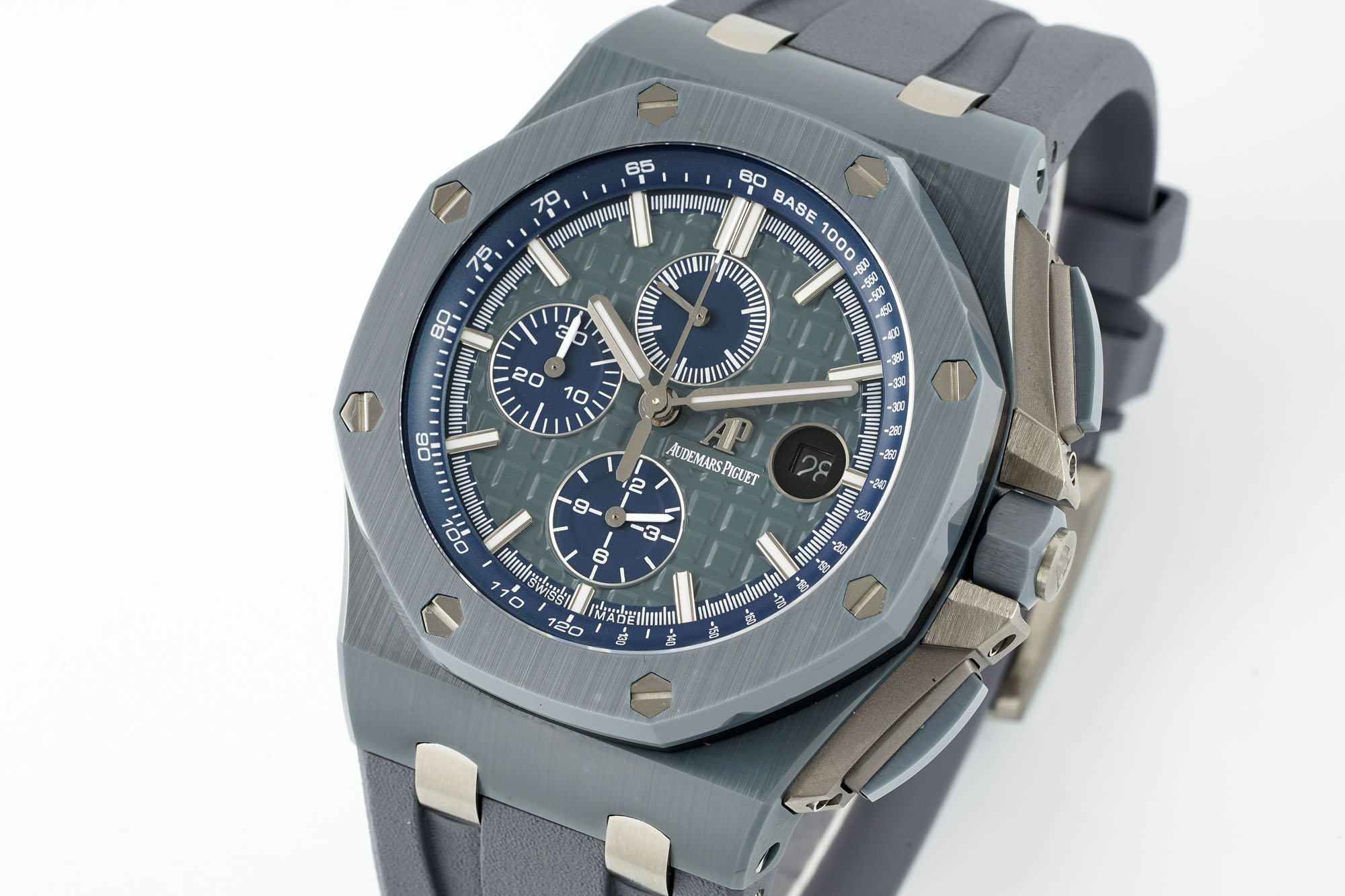 APJ Super Ceramic Masterpiece—the Royal Oak Offshore 26400 series watch, crafted from an all-new ceramic material that is lightweight, scratch-resistant, hypoallergenic, and fade-proof. The entire watch features CNC-grade polishing; the diamond-shaped case is smooth to the touch, and the brushed bezel flows seamlessly. Every hexagonal screw sits flush with the bezel. The TPE-enhanced calendar display is indistinguishable from the original, and the hand-applied super-luminous material matches the original in both color and brightness. The ergonomically designed, slightly adjustable lugs ensure superior comfort. Powered by a brand-new custom Cal. 3126 movement, it perfectly replicates all chronograph functions, with ruby jewels on the bridge that look even more authentic and offer enhanced stability. The watch’s weight and texture exude genuine craftsmanship—a product of APJ.factory, guaranteed to be a masterpiece!