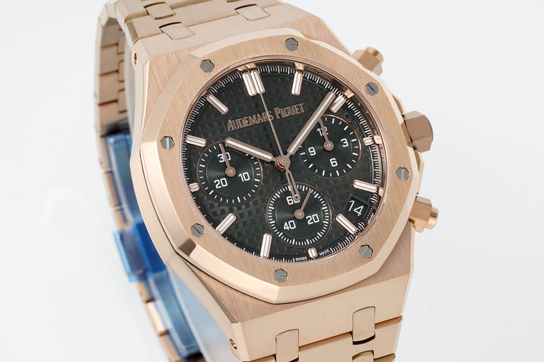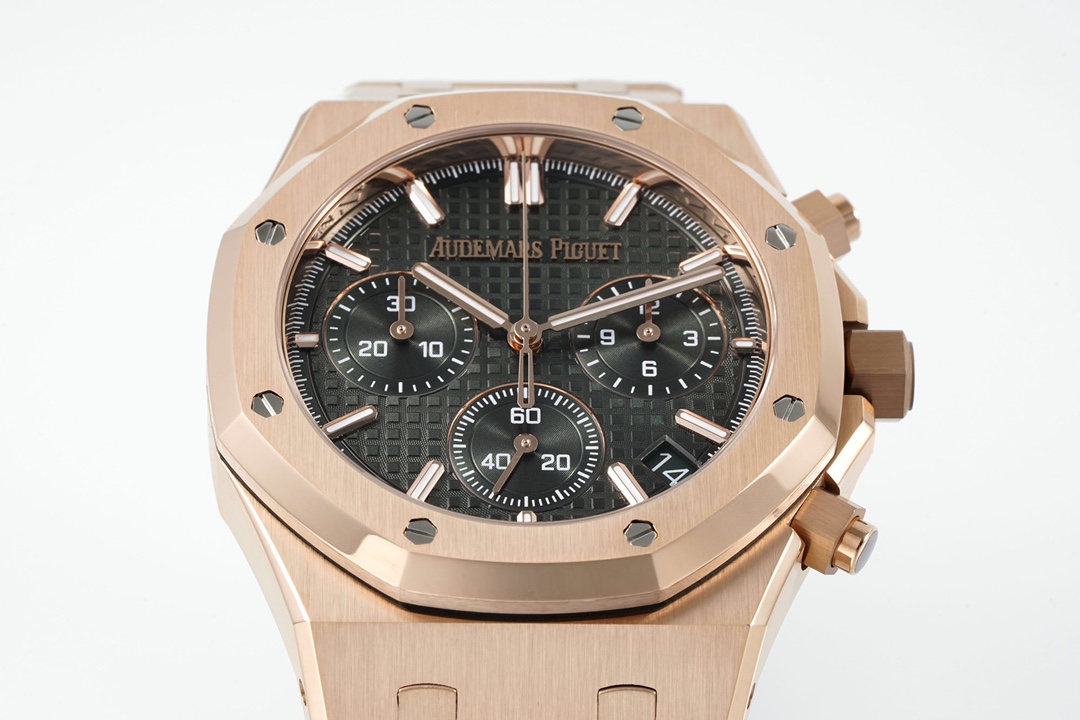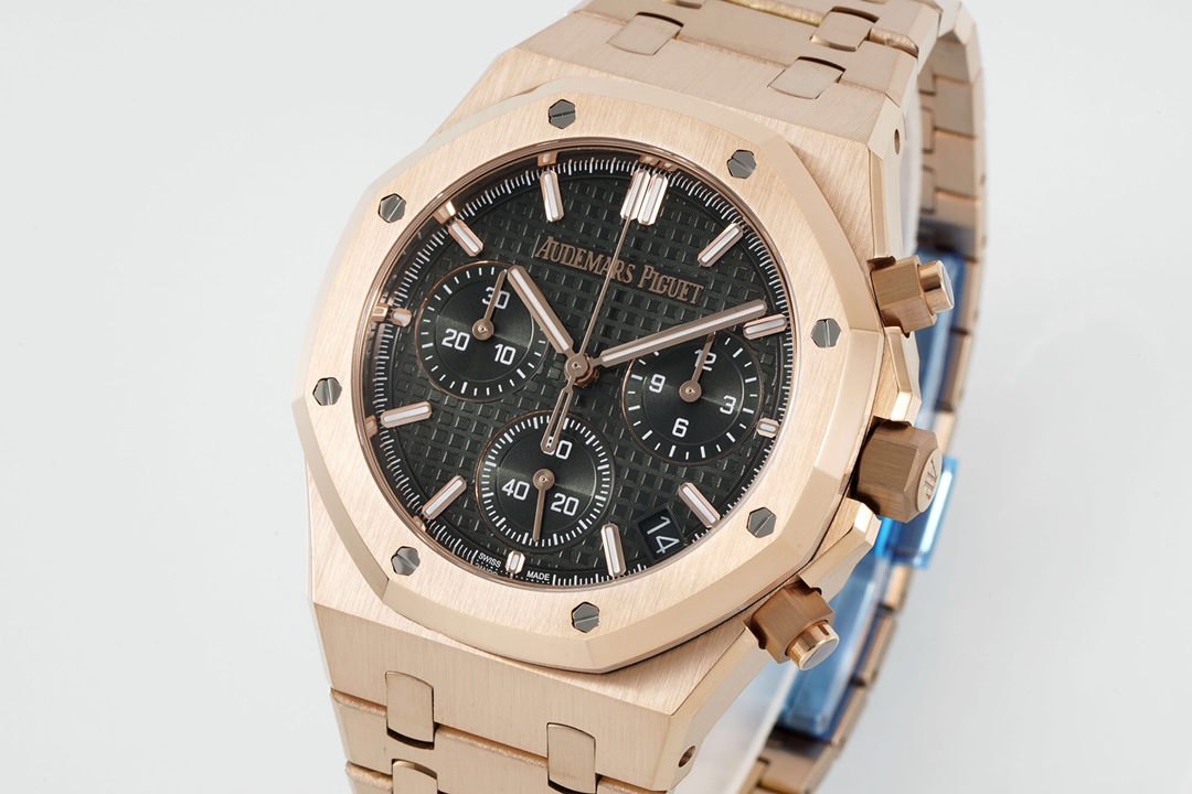 The new APS Audemars Piguet Royal Oak 26240 is a 41mm stainless steel automatic chronograph powered by the in-house Calibre 4401 movement developed by APS, featuring a flyback chronograph, hour/minute/small seconds display, and date function. Its iconic octagonal bezel, secured by eight hexagonal screws, is paired with a “Grande Tapisserie” large-pattern dial, creating a striking sense of depth. The integrated stainless steel bracelet continues the classic design of the first Royal Oak from 1972, blending sportiness with elegance. The newly developed in-house movement features a column wheel and vertical clutch mechanism, operating at a frequency of 28,800 vibrations per hour—identical to the original—with a power reserve of approximately 70 hours and water resistance to 50 meters. APS blends haute horlogerie craftsmanship with avant-garde aesthetics, creating a quintessential example of a luxury sports watch. After extensive comparative testing, APS has achieved a perfect replica, coming as close as possible to the original.