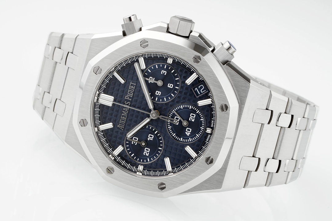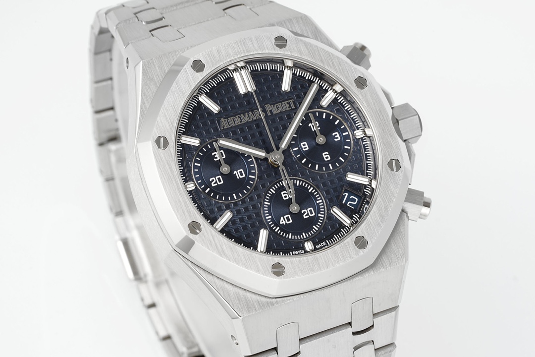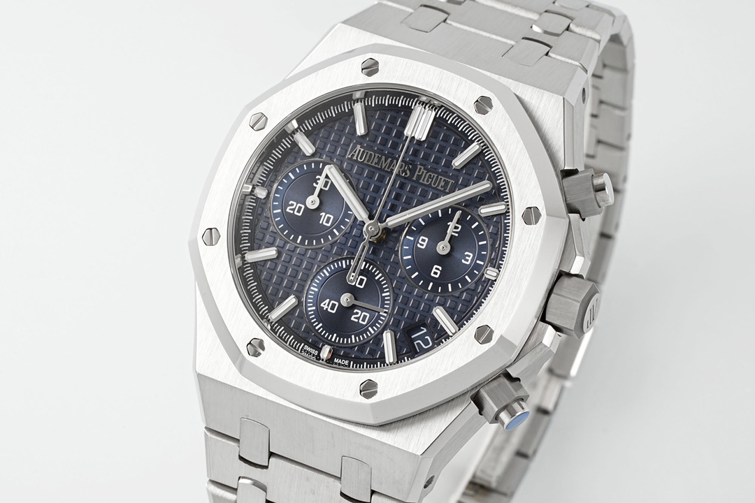 The new APS Audemars Piguet Royal Oak 26240 is a 41mm stainless steel automatic chronograph powered by the in-house Calibre 4401 movement developed by APS, featuring a flyback chronograph, hour/minute/small seconds display, and date function. Its iconic octagonal bezel, secured by eight hexagonal screws, is paired with a “Grande Tapisserie” large-pattern dial, creating a striking sense of depth. The integrated stainless steel bracelet continues the classic design of the first Royal Oak from 1972, blending sportiness with elegance. The newly developed integrated movement features a column wheel and vertical clutch mechanism, operating at a frequency of 28,800 vibrations per hour—identical to the original—with a power reserve of approximately 70 hours and water resistance to 50 meters. AP blends haute horlogerie craftsmanship with avant-garde aesthetics, making it a quintessential example of a luxury sports watch. After extensive comparative testing, APS has achieved a perfect replica, coming infinitely close to the original.