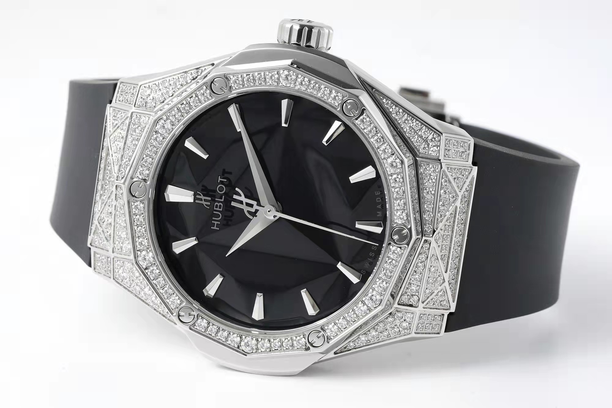 The second-generation Classic Fusion watch is a collaboration between Hublot and artist Richard Orlinski. This sculptor is known for using edges, chamfers, and faceted elements to create sharp, defined angles. Consequently, the watch designed in collaboration with him features these elements scaled down to precise proportions on the dial, resulting in a stunning mirror-like effect. The iconic 12-sided bezel, along with the angular case and dial, also reflect a mesmerizing glow.