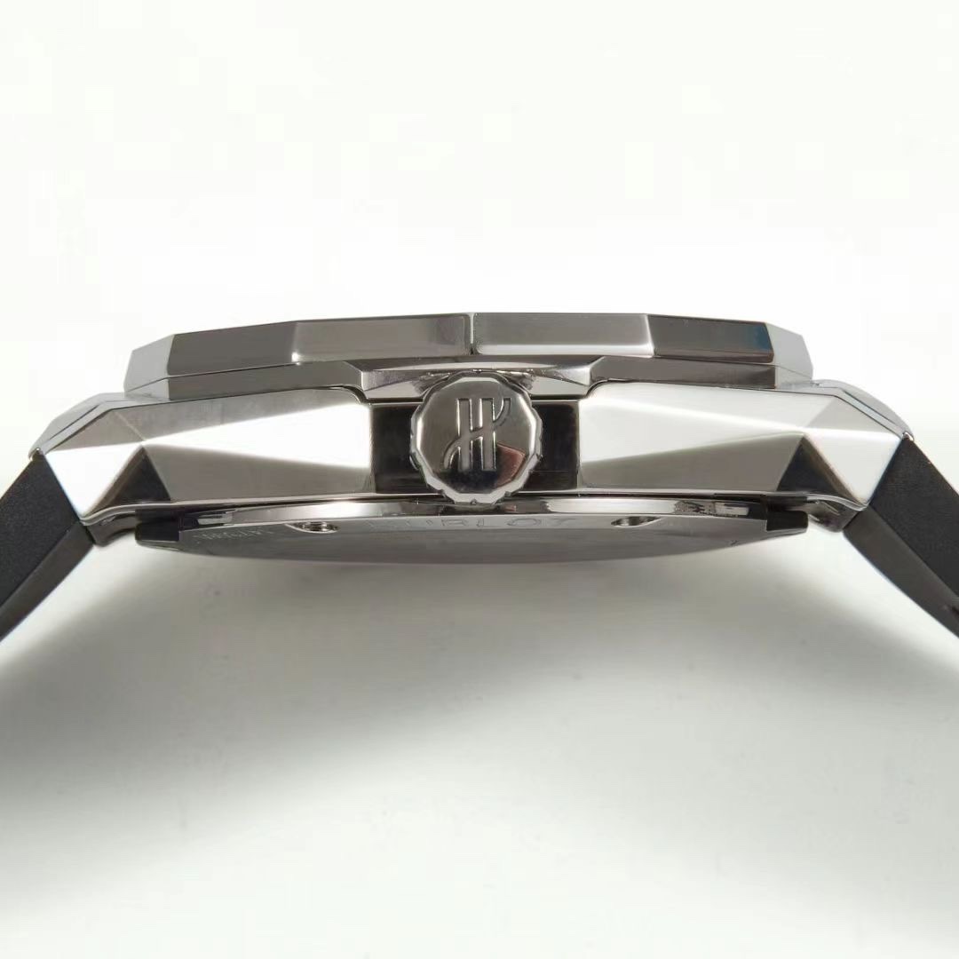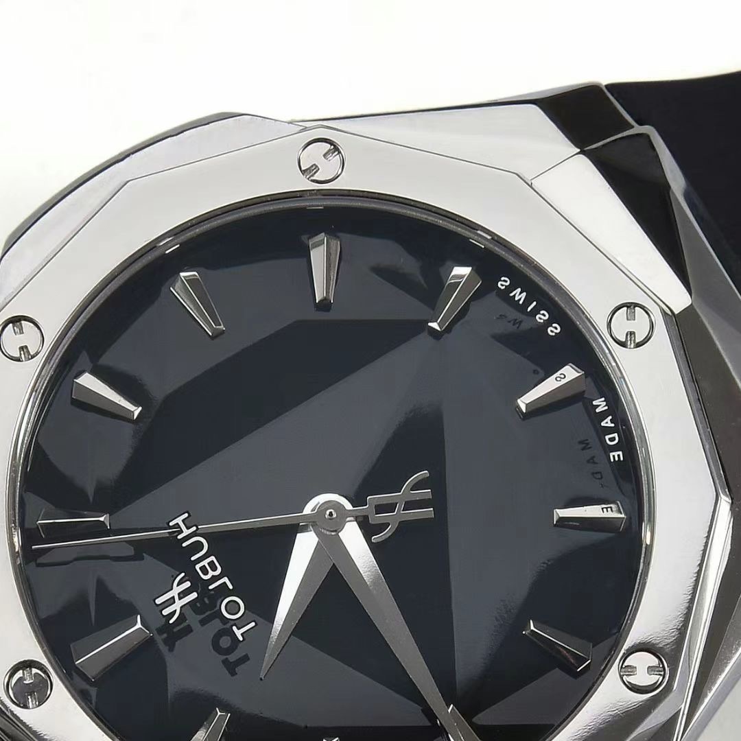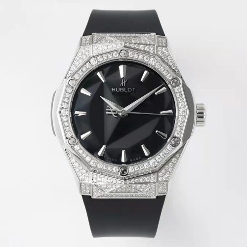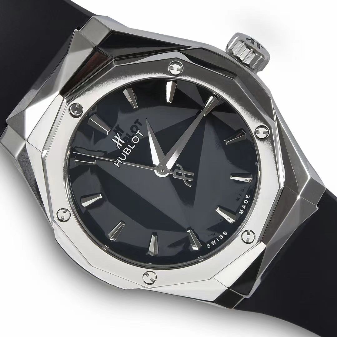 The second-generation Classic Fusion watch is a collaboration between Hublot and artist Richard Orlinski. This sculptor is known for using edges, chamfers, and faceted elements to create sharp, defined angles. The watch designed in collaboration with him incorporates these elements, scaled down to precise proportions on the dial, resulting in a stunning mirror-like effect. The iconic 12-sided bezel, along with the angular case and dial, also reflect a captivating glow.