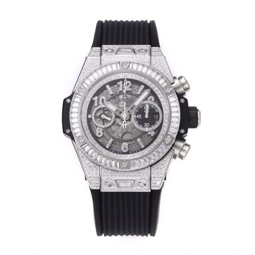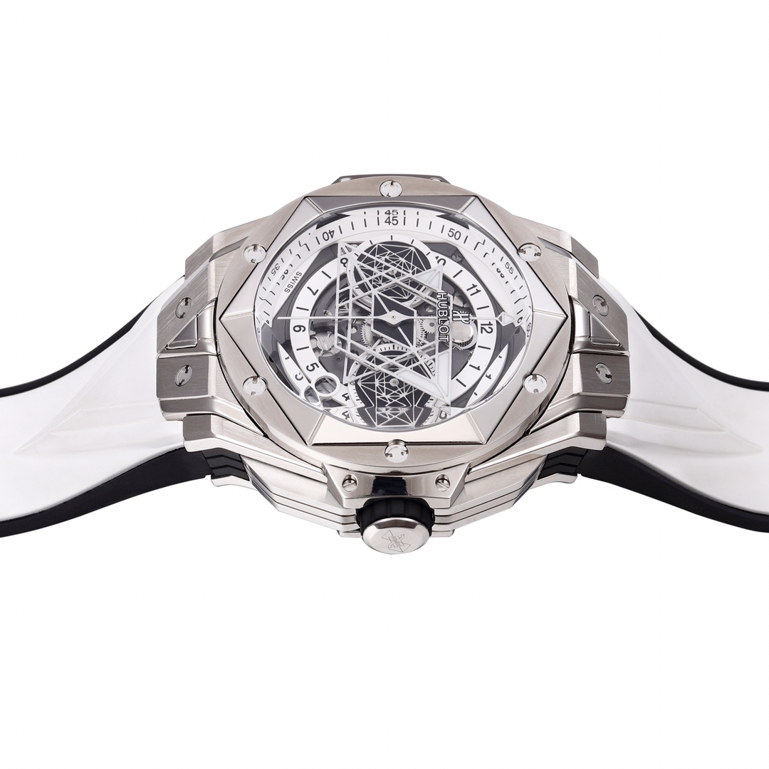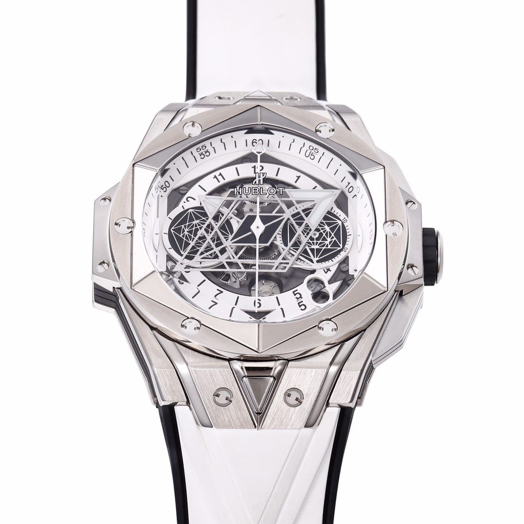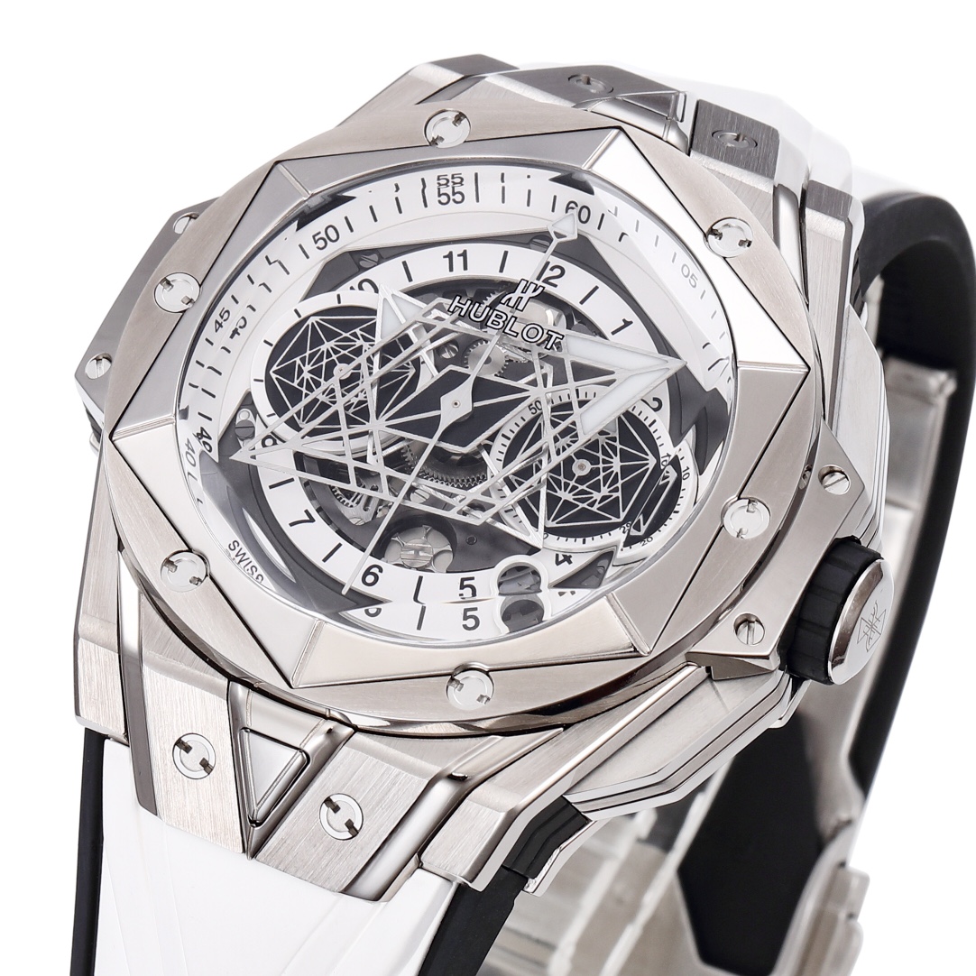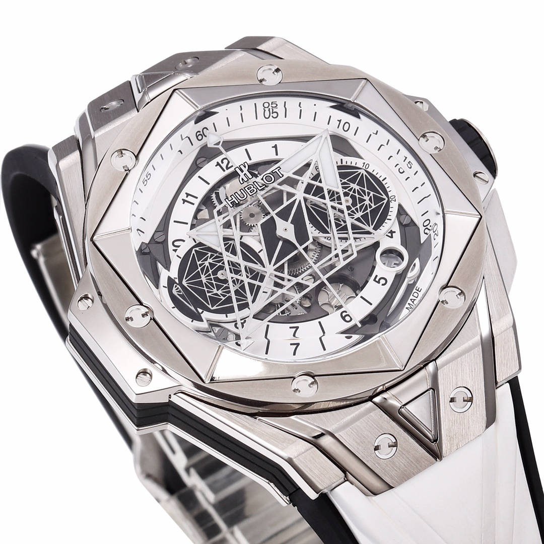 BBF Ultimate Replica HUBLOT’s New Big Bang Sang Bleu II Tattoo II Watch Hengbao’s Most Popular Model The only one on the market featuring an all-titanium construction as standard, with polished, satin-finished, sliced, engraved, chamfered, and faceted surfaces, creating an alternating pattern of hexagons, diamonds, and triangles, creating a harmonious and captivating visual effect. Custom-made Hublot-exclusive UNICO HUB 1240 automatic flyback chronograph movement—the industry’s only replica featuring a 4.5 o’clock openwork date ring and window, a 60-minute chronograph at 3 o’clock (Note: 7750 movements on the market are limited to 30-minute chronograph), a horizontal clutch at 8 o’clock, and a small seconds wheel at 9 o’clock. The crown features the original half-tooth design with the engraved logo always facing upward. The sapphire crystal glass features a beveled edge, and the sandblasted hands with iridescent patterns offer impeccable texture. Dimensions: 45mm, thickness: 16.6mm, weight: 153g, with a similarity rate exceeding 95%. All functions are perfectly realized. Top-tier quality. We invite enthusiasts to appreciate this piece. (Produced by BBF—guaranteed to be a masterpiece.)
