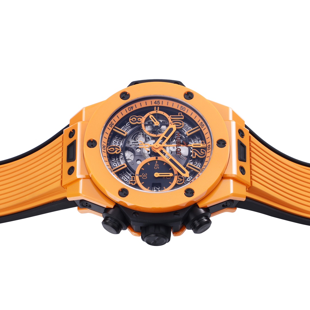 The BBF Orange Ceramic Makes Its Debut HUBLOT BIG BANG Unico Colorful Ceramic Watch Features the exclusive HUB 1280 automatic chronograph movement developed for Hublot, a skeletonized date ring at the 3 o’clock position, 60-minute chronograph at the 3 o’clock position (Note: Standard 7750 movements on the market are limited to 30-minute chronograph functions), horizontal clutch at the 8 o’clock position, small seconds wheel at the 9 o’clock position, sapphire crystal glass, rubber strap with ceramic folding clasp. The iridescent patterned hands boast impeccable texture. 42mm case. All functions are 100% flawlessly executed. Top-tier quality. We invite enthusiasts to appreciate this masterpiece. (Produced by BBF—Guaranteed to be a masterpiece)