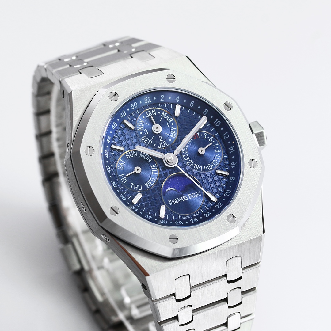 Audemars Piguet Royal Oak Perpetual Calendar Watch from Noble Watches, featuring a noble and elegant blue dial paired with a sleek stainless steel case, perfectly embodying Audemars Piguet’s aesthetic design and the exceptional technical prowess of its complicated functions.