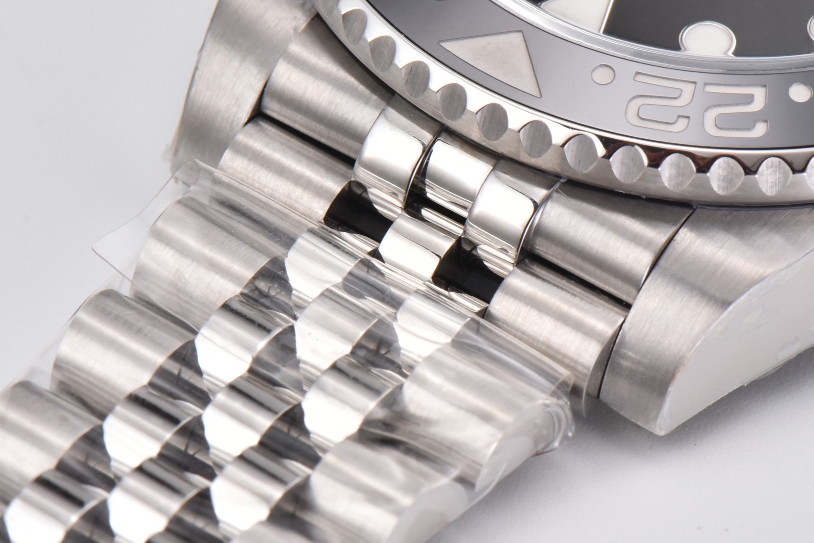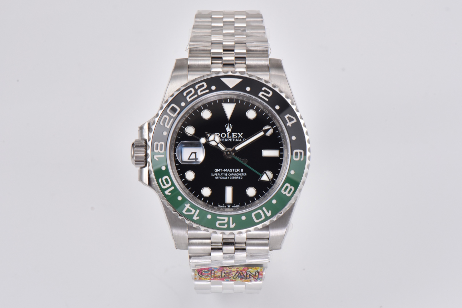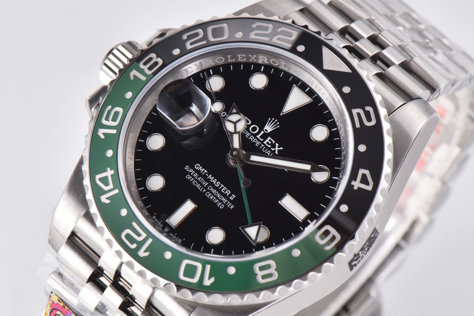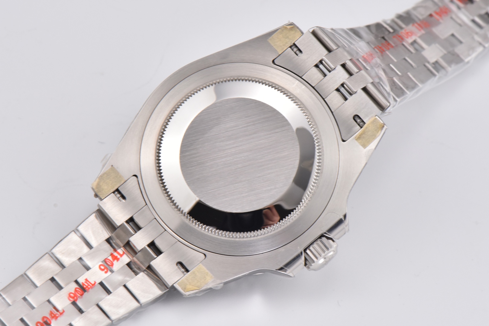 The case exterior fully utilizes 904L steel, perfectly replicating the GMT’s entire case shape while improving the GMT bezel’s tactile feel. The crown features an embossed crown 👑 effect.