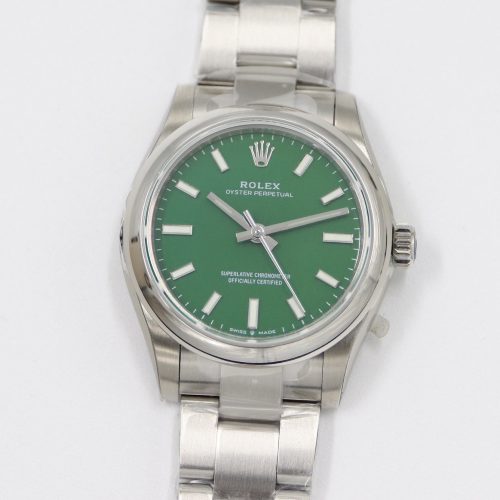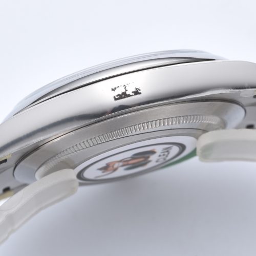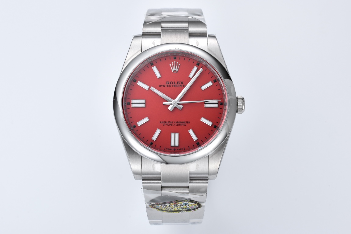 This 41mm Perpetual features the 3230 movement, crafted with a perfect 1:1 mold. A genuine vs. replica comparison follows. All components exhibit extremely high similarity, with the dragon fruit/red dial. The pursuit of clean details is evident to all. The logo on the clasp represents a significant breakthrough in craftsmanship—CNC engraved with precise shape and a glossy finish on the inner side.
