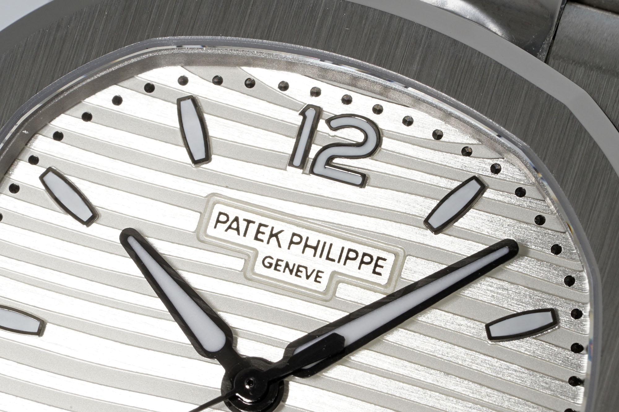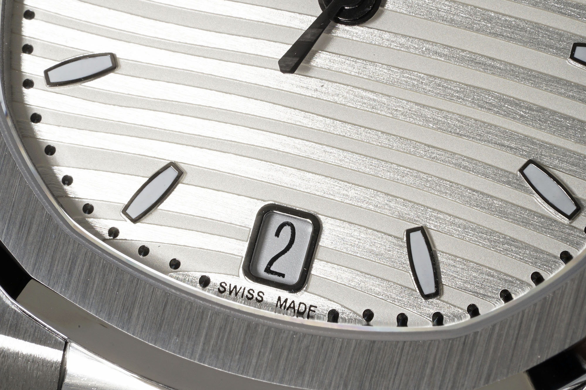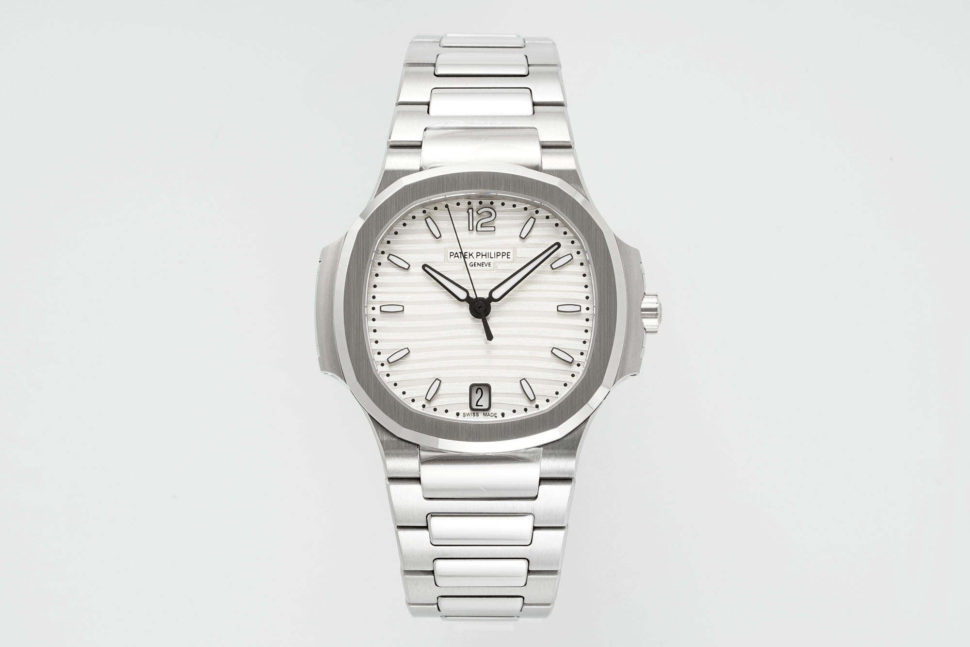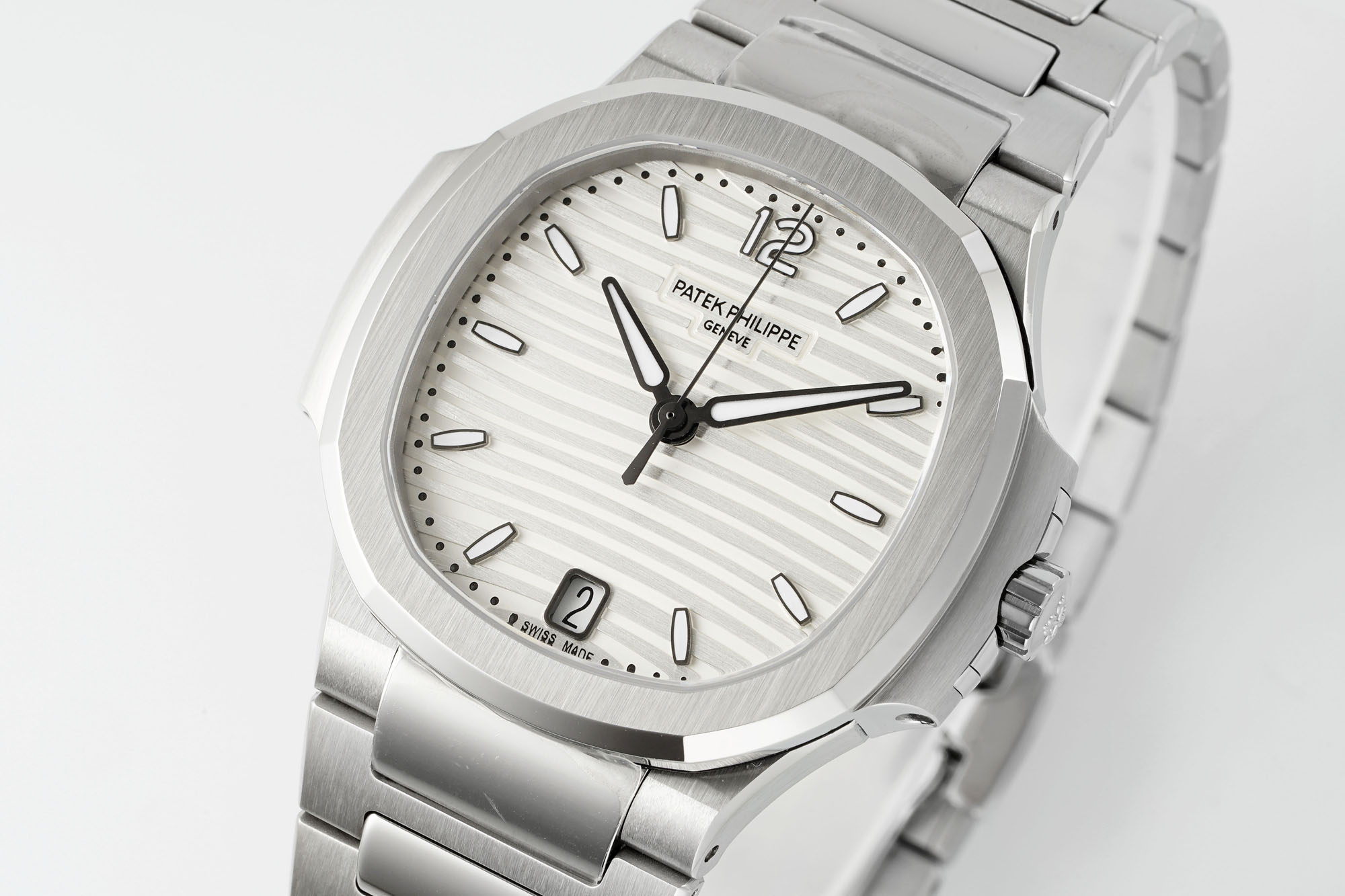 DDF’s Most Beautiful Nautilus 7118 1: The most authentic silver-white finish available online; the white background with silver brushed wave patterns shimmers beautifully under light. 2: The beveled edges of the dial markers match the original, and the beading on the marker edges is the same exquisite size as the original. 3: The polished edges of the lugs feature smooth, uniform arcs. 4: The CNC-chamfered “eagle beak” corners on all four lugs match the original. 5: The case back’s lug hooks and locking mechanism are precisely sized and meticulously crafted. 6: The bracelet’s brushed finish is fine and uniform, with no variations in thickness or breaks in the pattern; the polished sections are three-dimensional, straight, and exceptionally bright. 7: Custom-made 324 integrated movement from the Dandong factory, 3.4mm thick, with finely engraved lettering; original factory production ensures stable quality. 8: The full tungsten steel automatic rotor matches the original in weight, providing sufficient power to drive the movement; the chain will not break. 9: The rotor’s base pattern follows the original, with the first stripe being fine lines; the finely engraved leaf pattern is a 1:1 replica, and the rotor plate features beveled edges that perfectly match the original.