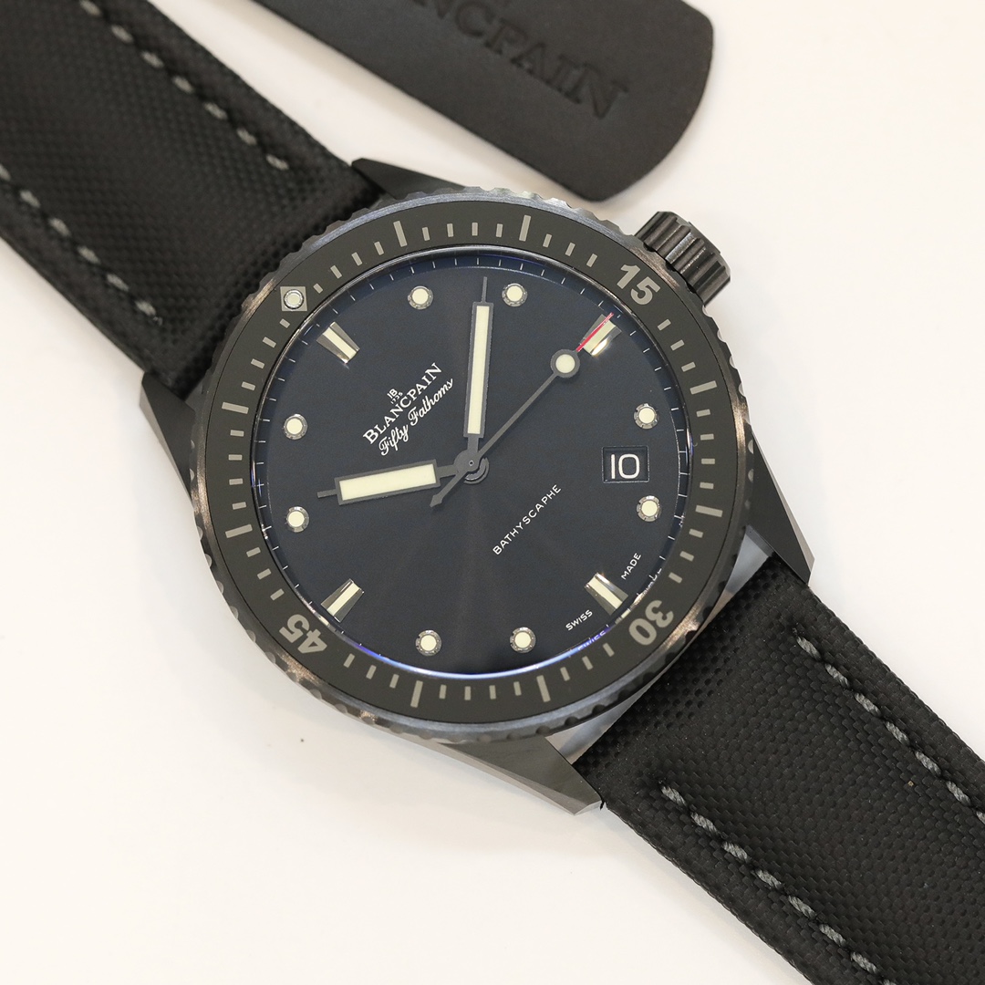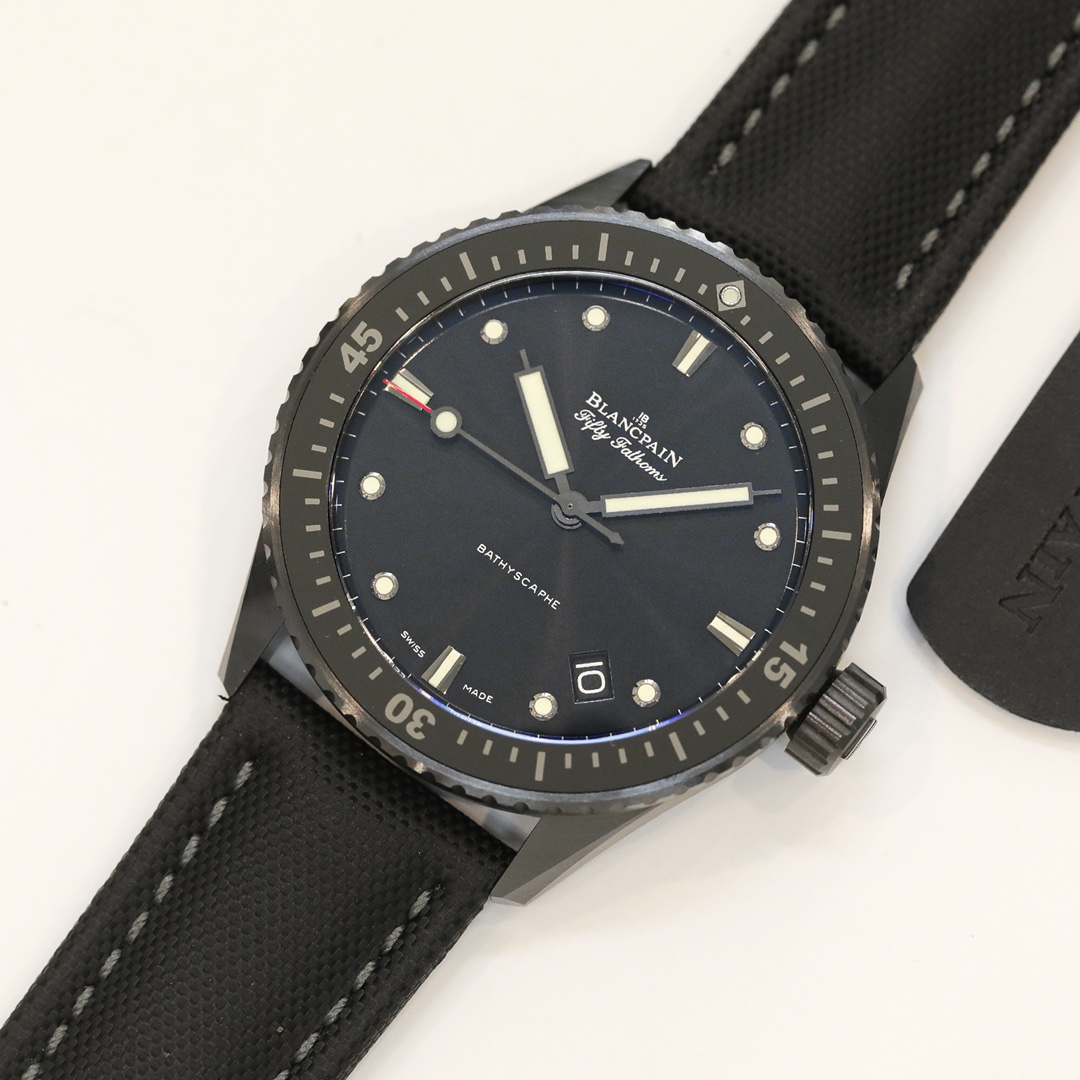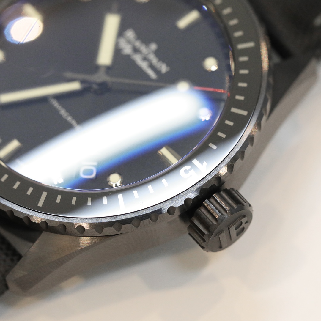 【GF Black Technology】Blancpain Fifty Fathoms 43.6mm Men’s Watch—High-tech satin-finished black ceramic features a brilliant luster, high hardness, colorfastness, stain resistance, and exceptional durability.