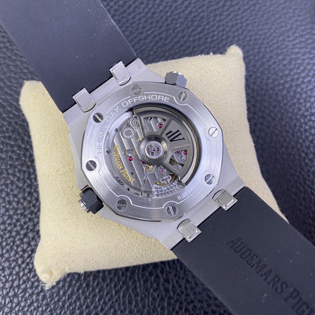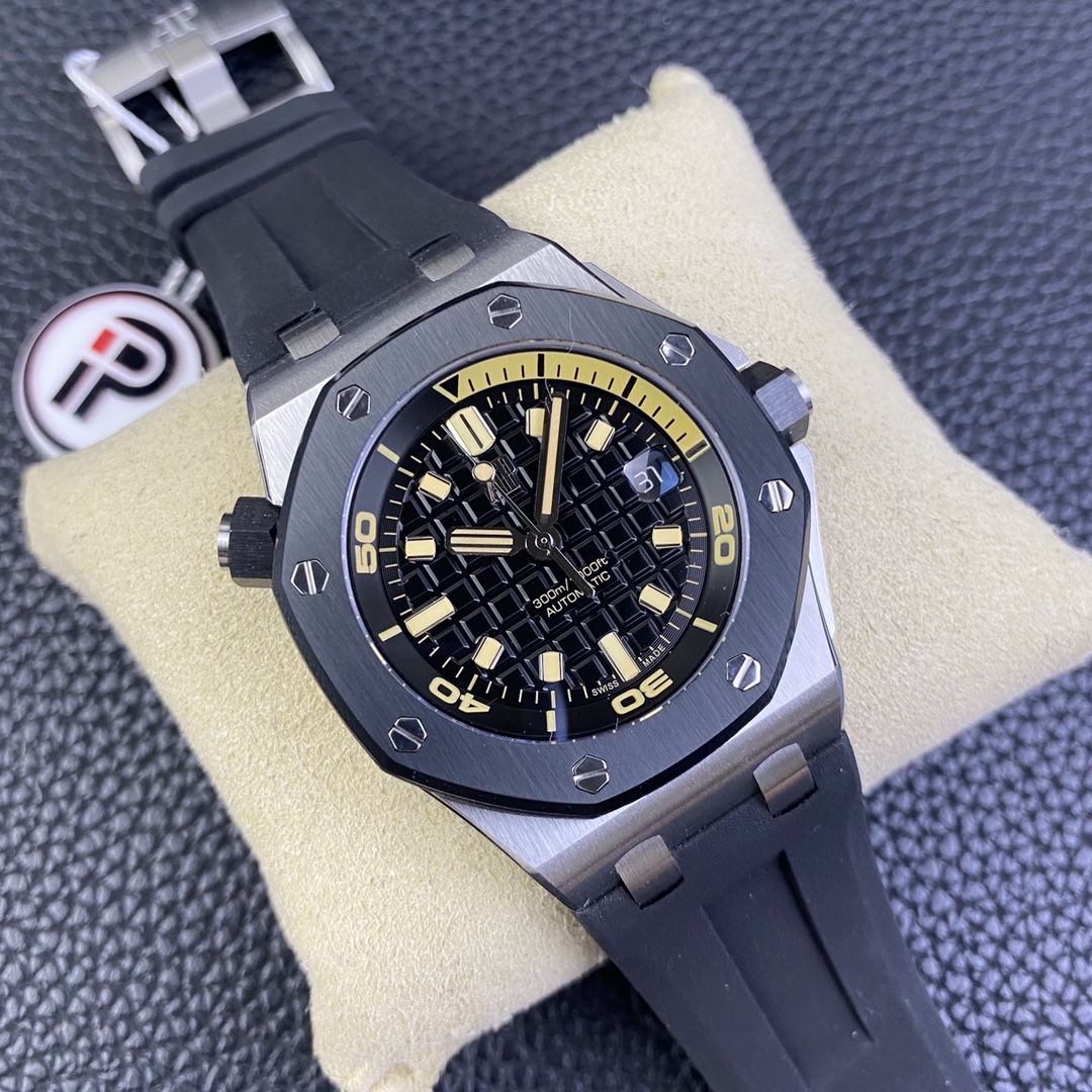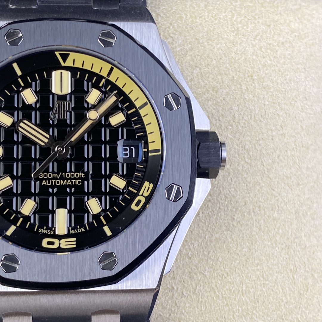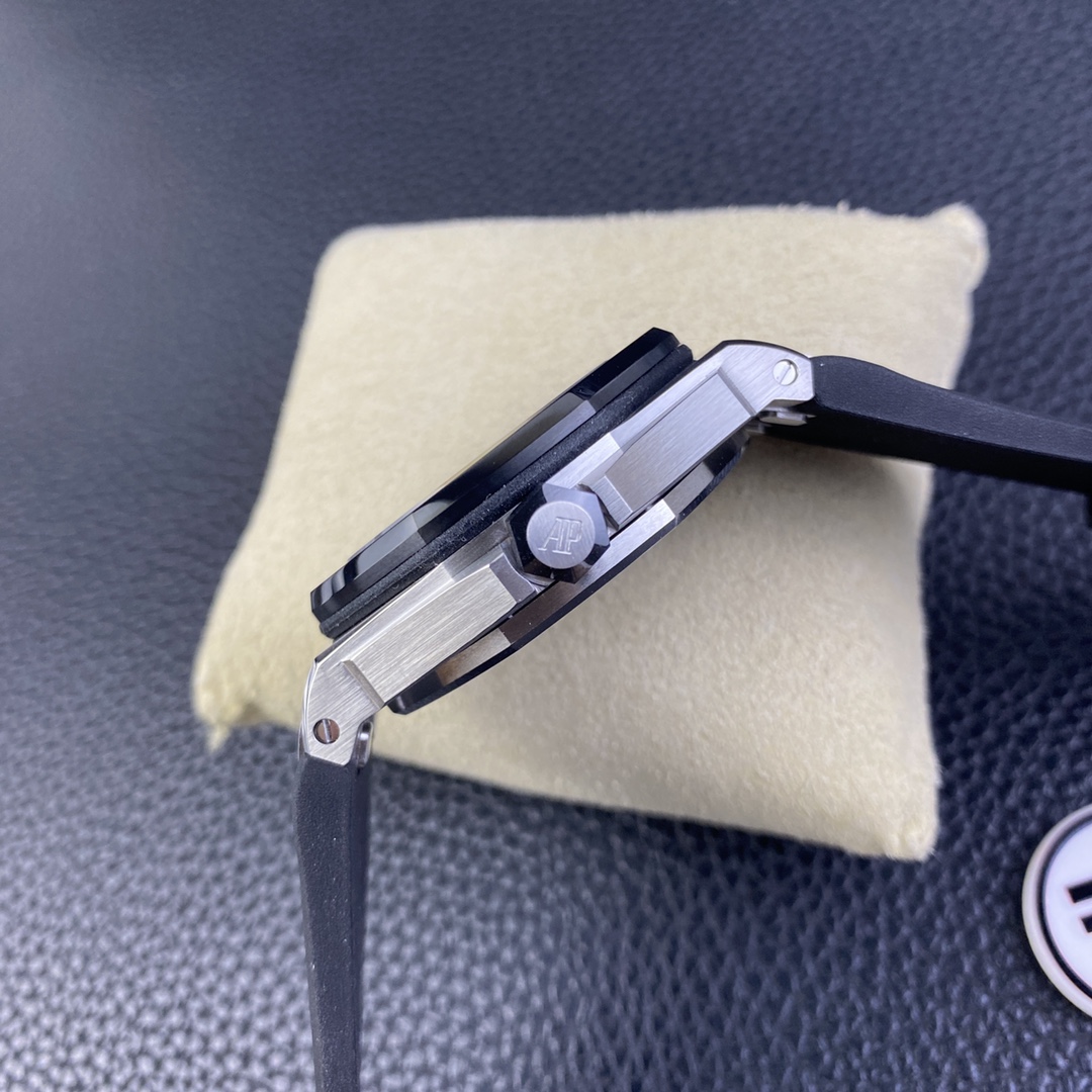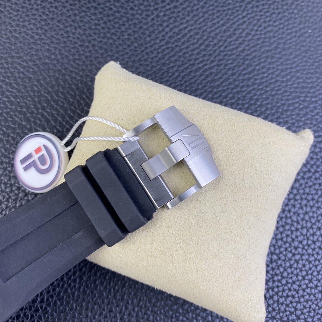 IP.Factory proudly presents the AP Audemars Piguet Offshore Quick-Release Dive Watch—Model 15720. This perfect replica sets a new standard—true perfection comes with a one-click quick-release mechanism! With a case size of 42mm x 14.2mm, the 15720, as the latest addition to the Royal Oak series, not only carries forward the family’s outstanding features but also introduces the most convenient—and hardest to replicate—one-click quick-release strap and buckle. IP Factory spared no effort, undergoing multiple mold-making iterations and trial-and-error processes to achieve a quick-release mechanism identical to the original. Whether removing or installing the strap with a single click, it achieves full interchangeability with the genuine model. 1: The lugs connecting the case to the strap—the most challenging component—were meticulously replicated by dismantling genuine lugs to examine their internal structure, ensuring a seamless one-click removal and one-click installation without any hassle. 2: The clasp is the first quick-release clasp introduced by Audemars Piguet, making it easier to change straps and adjust the length to meet your various needs. IP Factory also went through multiple mold-making iterations to achieve the original’s perfect balance—neither too tight nor too loose—when removing and attaching the clasp. 3: The case is crafted from stainless steel, paired with anti-reflective sapphire crystal glass for both the front and back, and features a black ceramic screw-down crown. All specifications and materials are meticulously matched to the genuine product via scanning. 4: The movement features a modified 9015 caliber, now upgraded to the all-new Calibre 4308 automatic winding movement. It boasts a robust power reserve, long-lasting power, and stable timekeeping, eliminating any after-sales concerns. 5: Exclusive, superior finishing on the movement bridges creates a more three-dimensional effect. The rotor features a newly customized color specifically matched to the genuine model. 6: The most user-friendly movable lug buffer ensures a perfect fit with the genuine model. This is a feature the IP factory has put a lot of effort into achieving, providing a movable buffer effect on top of the quick-release mechanism. 7: The dial features an engraved “Méga Tapisserie” large checkered pattern, paired with luminous 3D hour markers and Royal Oak hands, Black rotating inner bezel with a beige 0-15 minute zone. 8: Features imported luminescent filling, offering the longest-lasting glow and the most uniform inner scale markings. 9: Calendar window with a magnifying lens identical to the original, providing exceptional clarity. 10: The strap uses imported rubber molded from the latest genuine rubber straps; both the texture and quality perfectly match the original, with a more premium feel. 11: The entire watch from IP Factory comes equipped with a one-piece transparent protective case identical to the genuine model, ensuring proper protection when the watch is not in use. This is a feature other manufacturers simply cannot match. The watch functions with precise and stable timekeeping, and its appearance is a direct scan of the genuine model! A pixel-level replica, it’s worth admiring time and time again!
