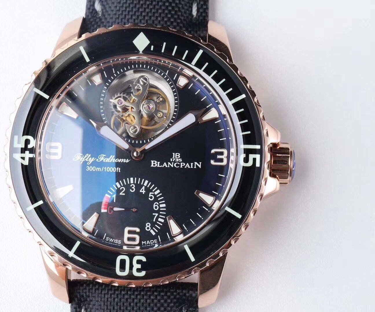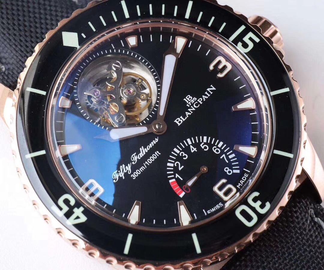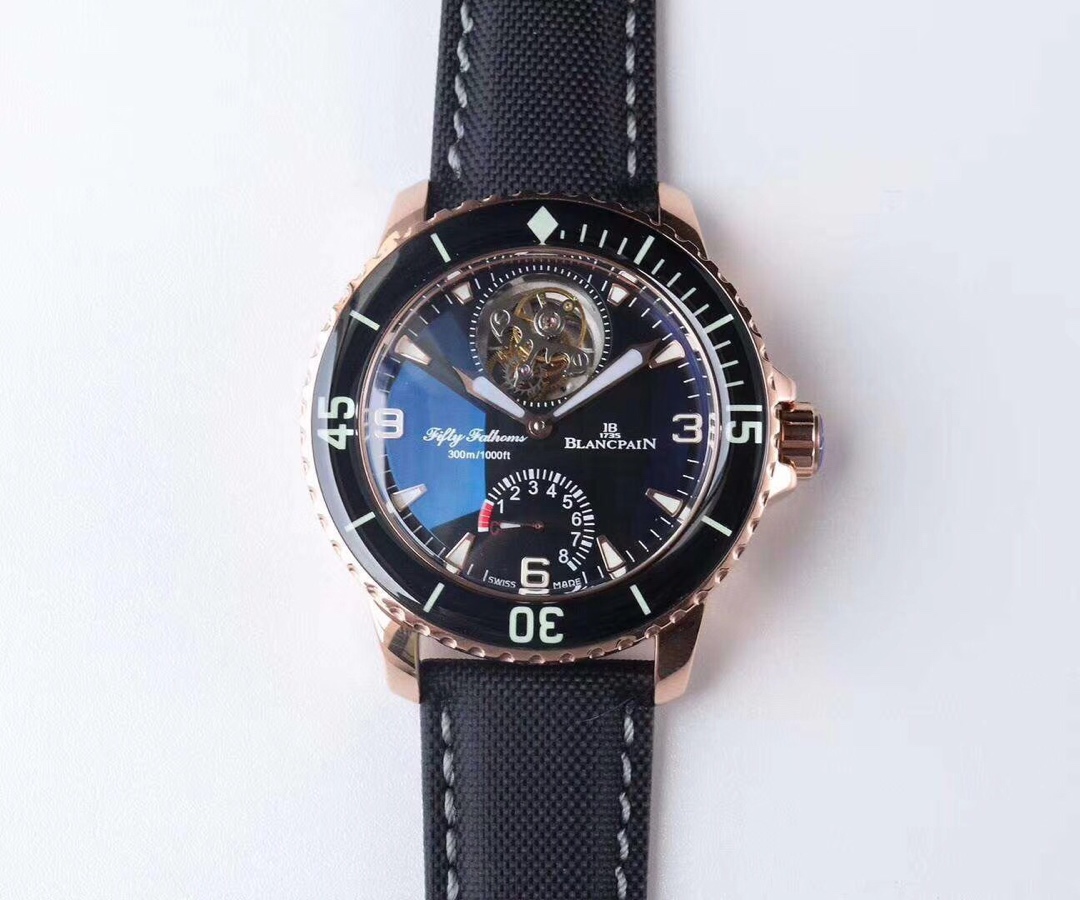 JB Factory Blancpain Fifty Fathoms Ultimate Edition 5025-1530-52 Authentic Tourbillon Men’s Watch: First, the similarity of the movement mechanism has been significantly improved, with a reproduction rate reaching 90%. The mainplate features a guilloché finish and bears the same steel stamps as the original, while the balance wheel is plated with white gold, resulting in a noticeable upgrade in quality. Second, the blue anti-reflective coating on the crystal enhances the visual effect. Third, the brightness of the tourbillon has been improved, making the entire watch appear even more premium. It features the exact same functions as the genuine model: an automatic winding tourbillon with a genuine power reserve display at the 6 o’clock position! With a 45mm diameter, a sapphire bezel, a double-layered sapphire domed crystal, making the entire front face completely scratch-resistant. It features an 18K white gold-plated case, a reinforced 200-meter water-resistant caseback, an original screw-down water-resistant crown, and a water-resistant nylon strap. It comes with a folding clasp strap and an additional buckle strap. Currently, this is the most water-resistant genuine tourbillon available—made with genuine materials, faithfully recreating the original’s essence, and exuding the prestige of a luxury brand. The new favorite among connoisseurs! Crafted by JB Factory, specifically designed for top-tier tourbillons.