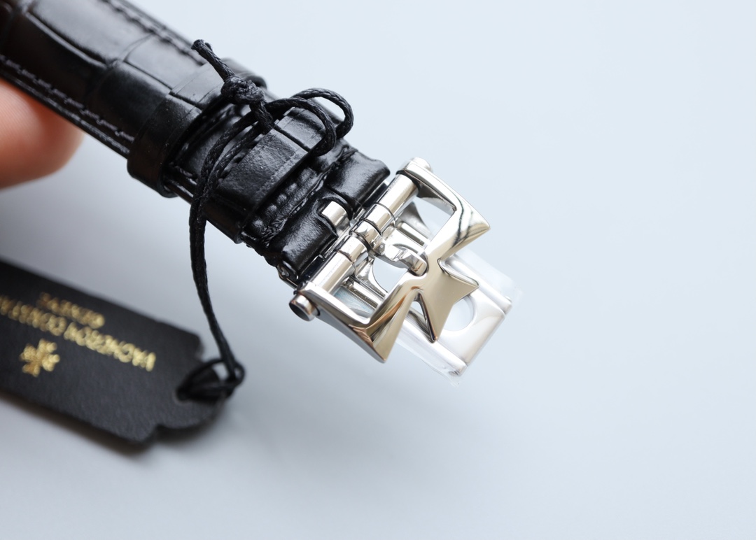【Strap and Buckle】A checkered Italian imported calfskin strap with a stainless steel folding clasp shaped like a half-Malta cross. The polished finish exudes understated elegance.