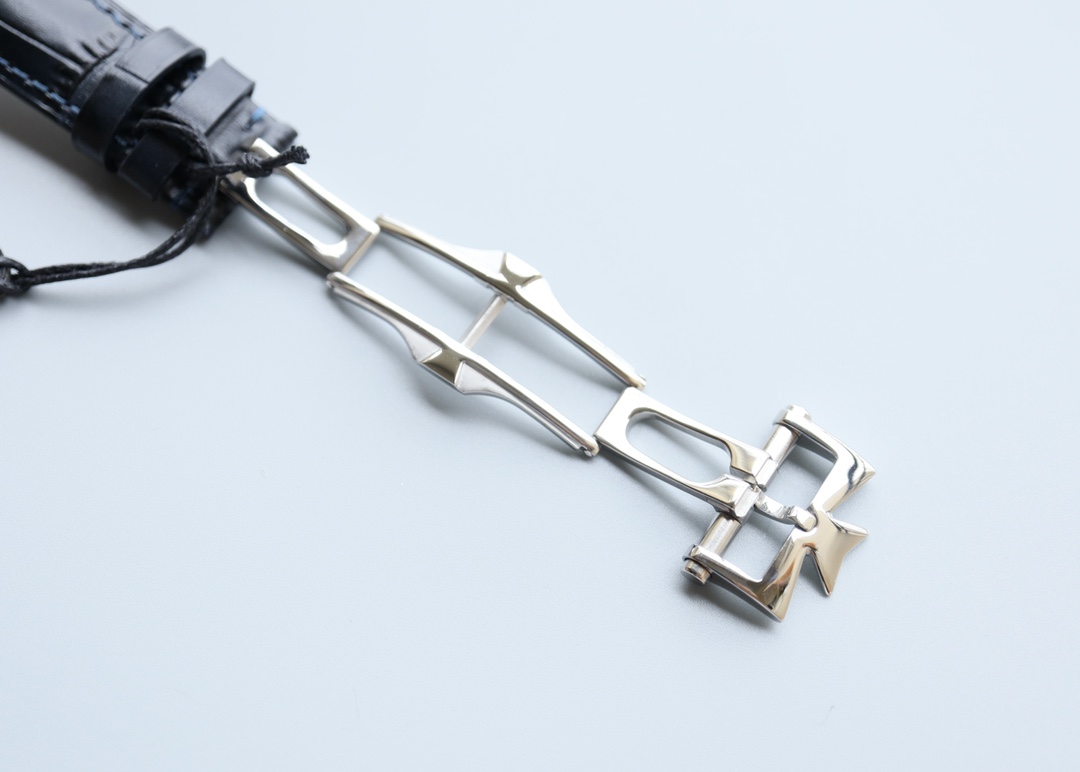【Strap and Buckle】A checkered Italian imported calfskin strap with a stainless steel folding clasp shaped like a half-Malta cross. The polished finish exudes understated elegance.