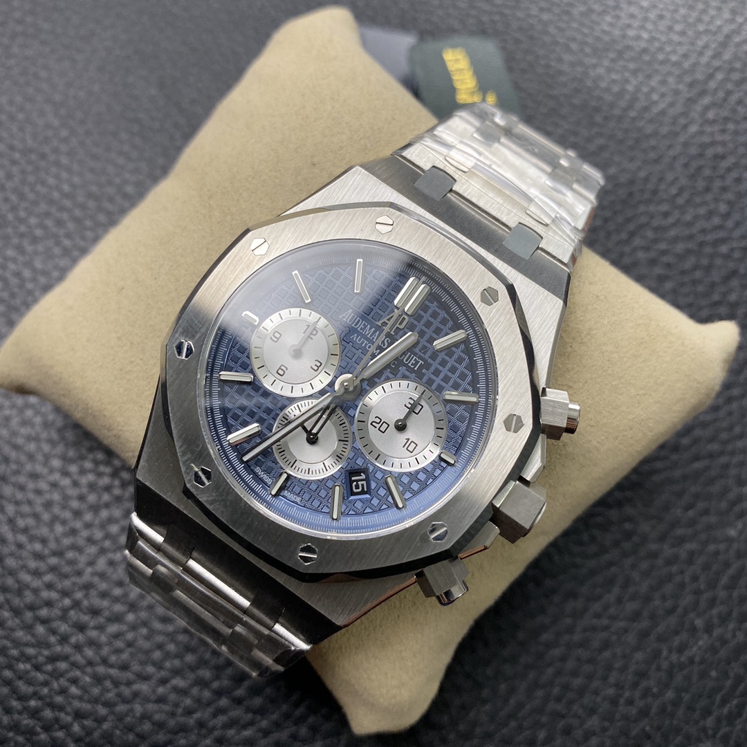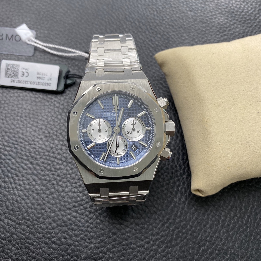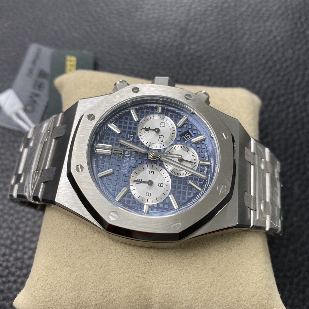 【4】The Royal Oak dial features the iconic “tapisserie” grid pattern—seemingly simple yet astonishingly detailed. It undergoes lathe machining, engraving, polishing, coloring, baking, riveted hour markers, and luminescent filling—truly a masterpiece where perfection lies in subtlety! Same functions, same quality, different price. Limited release. OM products are guaranteed to be masterpieces. OM’s latest breakthrough: the V2 Royal Oak 26331 Chronograph series. All functions and positions are identical to the original. Four major technical highlights: