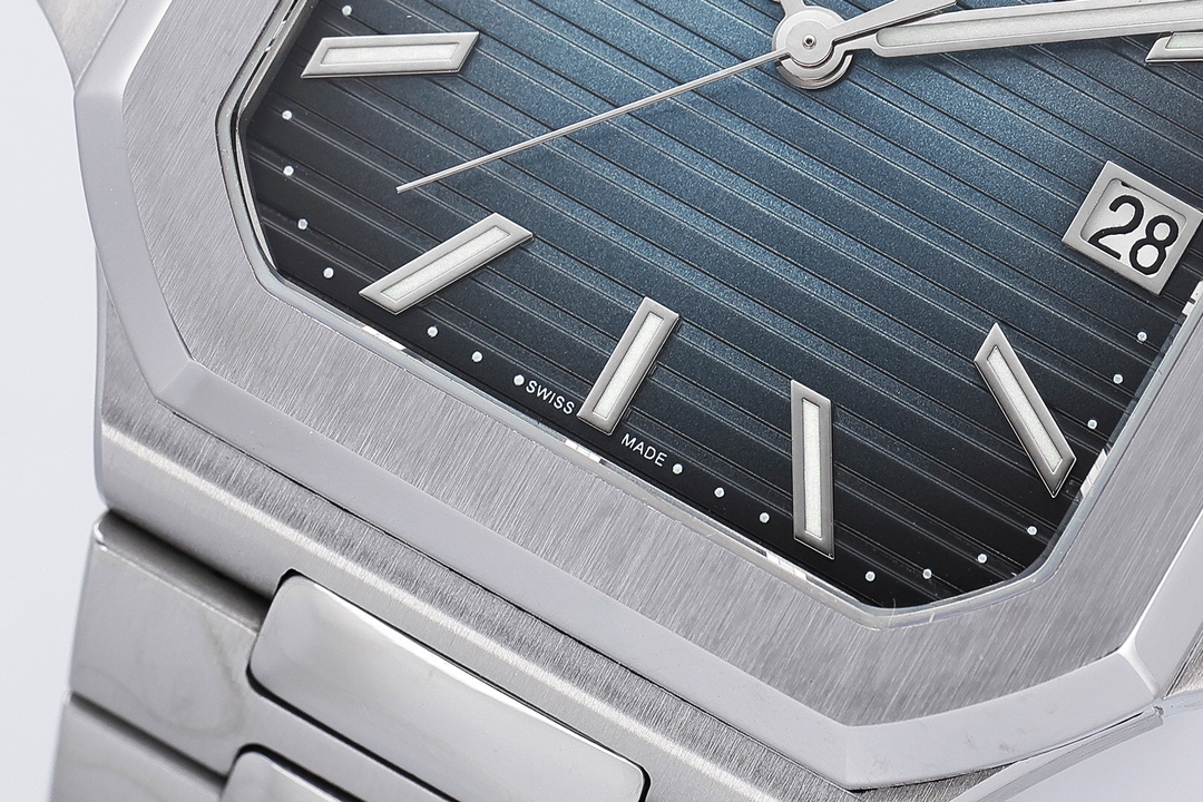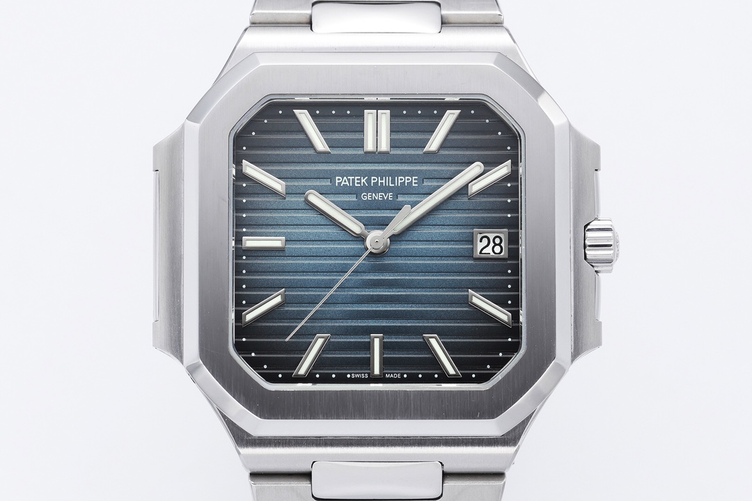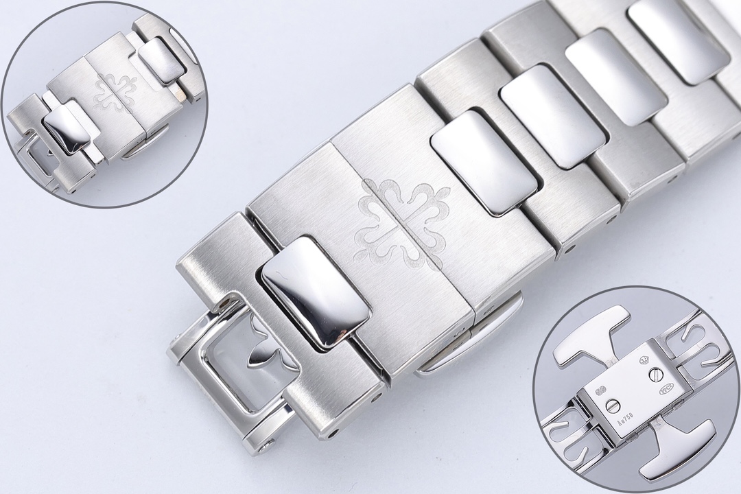 <Case> The distinctive square case with rounded corners features a two-layer nautilus shell structure, seamlessly integrated with the bracelet for a more cohesive look. Through masterful craftsmanship combining vertical brushed and mirror-polished finishes, PPF creates a modern, three-dimensional play of light and shadow. With a 45mm diagonal length, the watch’s exquisite craftsmanship and slim, wrist-hugging curvature ensure it feels neither bulky nor clunky on the wrist.