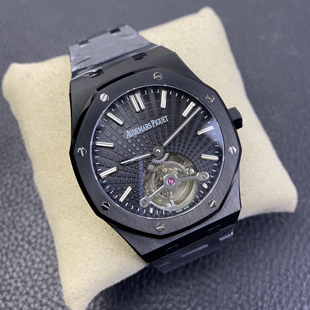 Audemars Piguet continues to pioneer innovation, unveiling the all-new Royal Oak Ultra-Thin Tourbillon at the Geneva Watch Fair. The iconic “Tapisserie” checkered pattern has been reimagined as a new sunburst design, offering a fresh visual experience. The sunburst pattern radiates from the tourbillon at 6 o’clock, with the grid size gradually increasing from the center outward, creating a beautiful color gradient effect. The sunburst pattern is dazzling and exceptionally elegant. The patterned dial is paired with three-dimensional white gold luminous hands featuring Swiss Super-LumiNova, ensuring clear time-reading even in dark environments—a highly convenient feature. The case measures 41 mm in diameter and 10.6 mm in thickness, housing a custom-made 2924 tourbillon movement with genuine bridges. It is one of the thinnest Audemars Piguet tourbillons currently available on the market, offering a power reserve of 70 hours. This exceptional tourbillon has garnered widespread admiration and attention from watch enthusiasts.