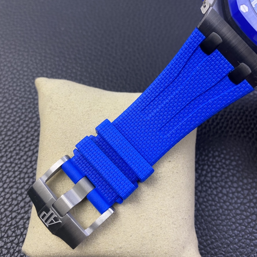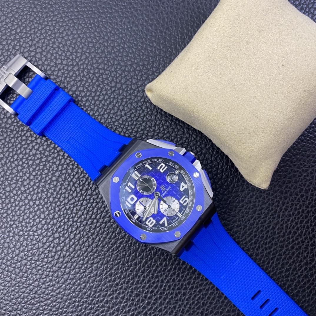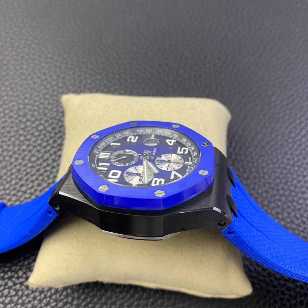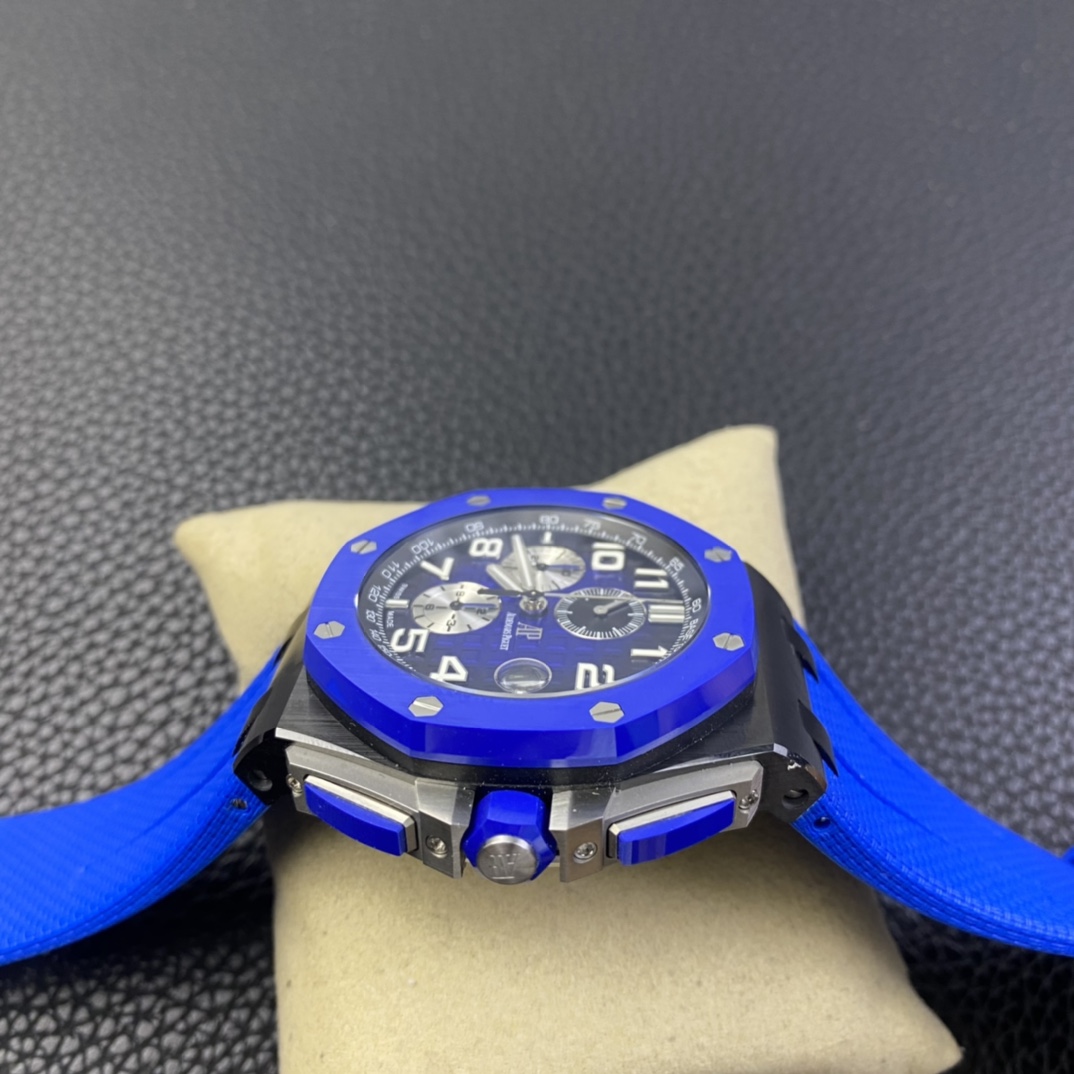 A revolutionary breakthrough and an epoch-making product—RS Factory’s colored ceramic watches have arrived! The Audemars Piguet Royal Oak Offshore 26405 series colored ceramic watch. RS Factory employs a brand-new colored ceramic forging technology. For the case and bezel, they spare no expense in using Japanese-imported zirconia. Without any pigments, the material is forged under ultra-high pressure and temperature to create ultra-high-density colored ceramic. Each piece then undergoes rigorous selection to ensure every finished product matches the original in color exactly—truly standing up to any nitpickers or keyboard warriors! CNC-grade polishing perfectly finishes every edge and corner of the case, ensuring it is smooth to the touch despite being ceramic. The brushed finish on the bezel, achieved through top-tier polishing techniques, ensures every line and thread is seamless. Every hexagonal screw sits flush with the case, eliminating even the slightest protrusion or indentation—a true embodiment of top-tier replica craftsmanship! The dial features Audemars Piguet’s classic large checkered pattern as its backdrop. The distinct, layered squares are meticulously polished, showcasing perfection in every detail. The three sub-dials stand out against the case, with the green and blue hands at the 6 and 9 o’clock positions particularly striking. The small seconds sub-dial at 12 o’clock features perfectly aligned circles. The date window at the 3 o’clock position, enhanced by the sapphire crystal’s concave lens, achieves a TPE magnification effect indistinguishable from the original. Every hour and minute hand, viewed from any angle, is completely free of burrs—a feature that resolves a long-standing frustration for many watch enthusiasts with a penchant for perfection! The hour markers and the central sections of the hands are filled with Swiss-imported luminescent powder, each individually hand-applied. The uniformity and richness of this application far surpass what machine-filling can achieve, and the brightness and glow color are virtually identical to the original! The movement features a 7750-modified 3126 chronograph caliber, with a small seconds sub-dial at 12 o’clock, and 12-hour and 30-minute chronograph sub-dials at 6 and 9 o’clock, respectively. It perfectly replicates all functions of the original model. Through meticulous refinement by the RS team, the stability of the base 7750 movement has been significantly enhanced, resolving the long-standing issue where chronograph models often fell short of expectations! Flawless in every detail, this is truly a top-tier masterpiece. We invite all watch enthusiasts to appreciate its craftsmanship! Produced by RS Factory—we only deliver the absolute best!