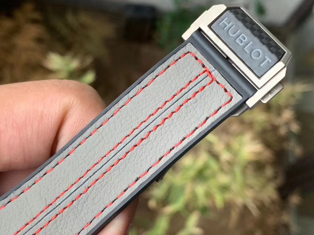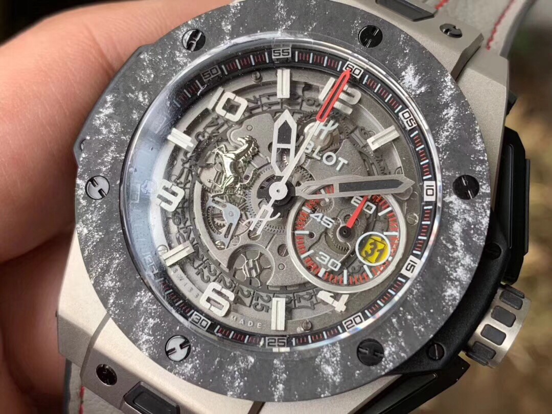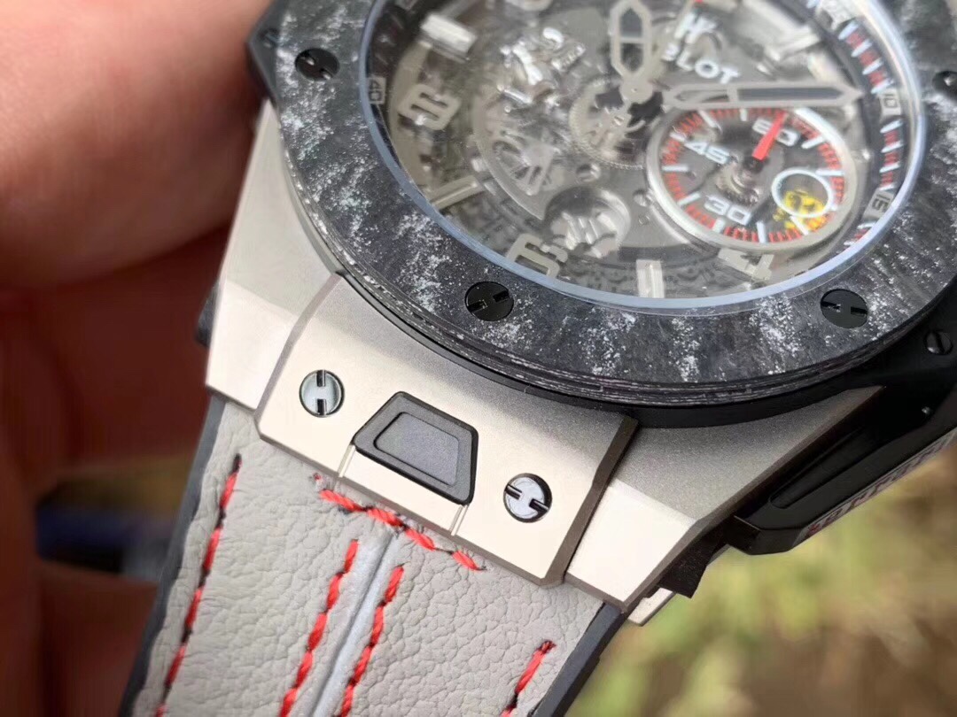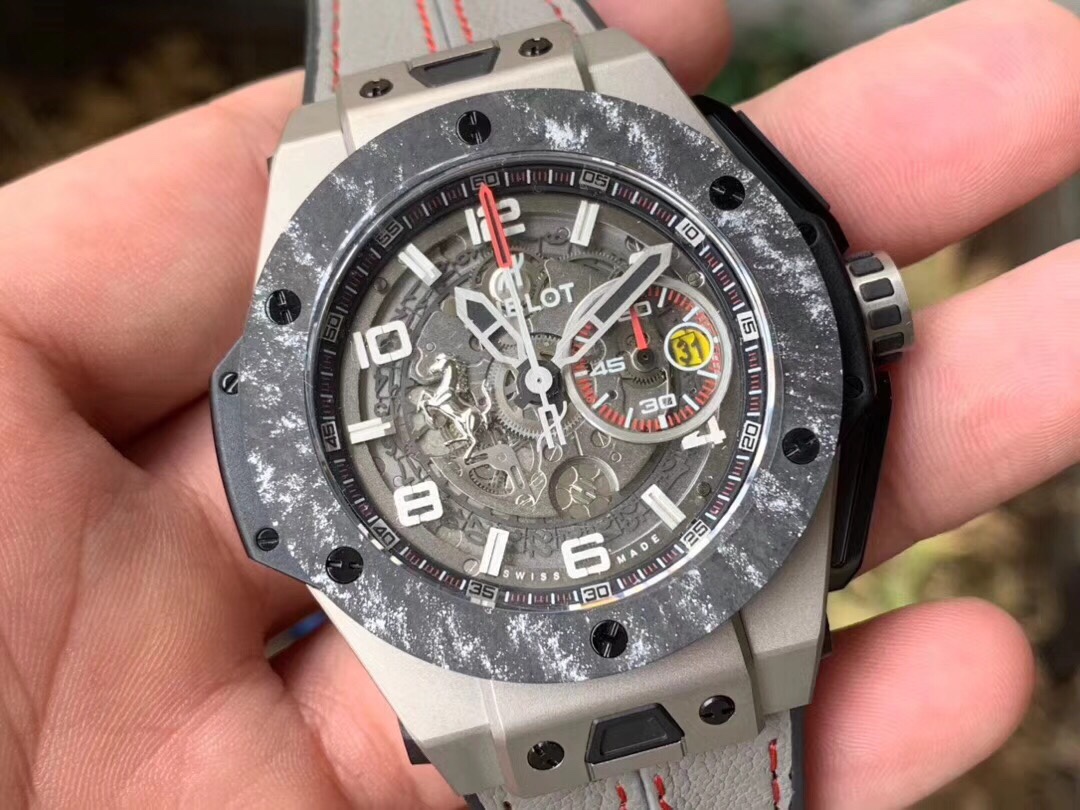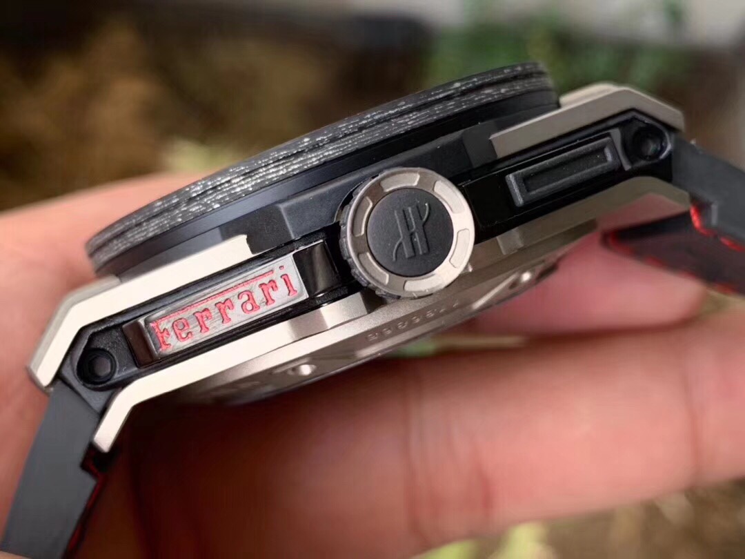 V6! Hublot Big Bang Ferrari Titanium F4 Series “Crown of Champions” Titanium and Carbon Fiber Bezel The market’s first-ever fusion of titanium and carbon fiber, featuring a layered composite bezel design Limited to a unique serial number: 401.NJ.0123.VR1️⃣ Bezel: Carbon fiber blended with titanium, 6 H-shaped black PVD-coated titanium screws, countersunk, polished and secured. 2️⃣ Crystal: Sapphire crystal with anti-reflective coating on both sides. 3️⃣ Lugs: Black synthetic resin. Side inserts: Black synthetic resin, carbon fiber inserts on the middle section of the case. Crown: Polished finish, black overmolded rubber insert. Pushers: 2 o’clock pusher: polished black PVD-coated titanium with black rubber insert. 4 o’clock pusher: satin-finished titanium, engraved with the Ferrari prancing horse logo, filled with red lacquer. Case back: titanium with sapphire crystal and anti-reflective coating on the inner side. 4️⃣ Dial: 45 mm, inlaid with the Ferrari Prancing Horse motif. Hour and minute hands: satin-finished rhodium-plated, coated with black Super-Luminova. Counter hands: finished in Ferrari red lacquer. Chronograph hands: satin-finished rhodium-plated, with Ferrari red tips, coated with black Super-Luminova. Hour and minute hands: Satin-finished gold-plated, coated with black Super-Luminova. Counter hands: Ferrari Red lacquer finish. 5️⃣ Movement: HUB1288 UNICO movement, a 1:1 replica of the Hublot-developed and manufactured automatic flyback chronograph movement. Date: Openworked date display with a yellow window at the 3 o’clock position. 6️⃣ Strap: Black natural rubber strap with gray Schedoni leather, stitched with red thread. Buckle: Folding clasp with black PVD-coated titanium and carbon fiber inserts.