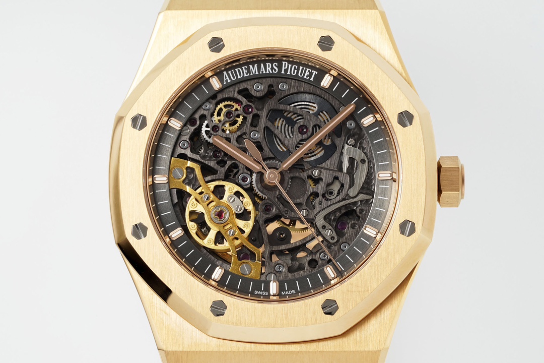 【Dial】A deep gray skeletonized dial with rose gold luminous 3D hour markers and Royal Oak hands. The skeletonized design, achieved by removing excess material, endows the watch with a unique blend of artistic and architectural beauty. This is a traditional craft that demands extreme precision; even the slightest deviation can cause timing errors in the movement or compromise shock resistance. ZF Factory has achieved a perfect balance between showcasing the inner beauty of the mechanical movement and ensuring accuracy, allowing us to appreciate the beauty of mechanical operation through the skeletonized structure.