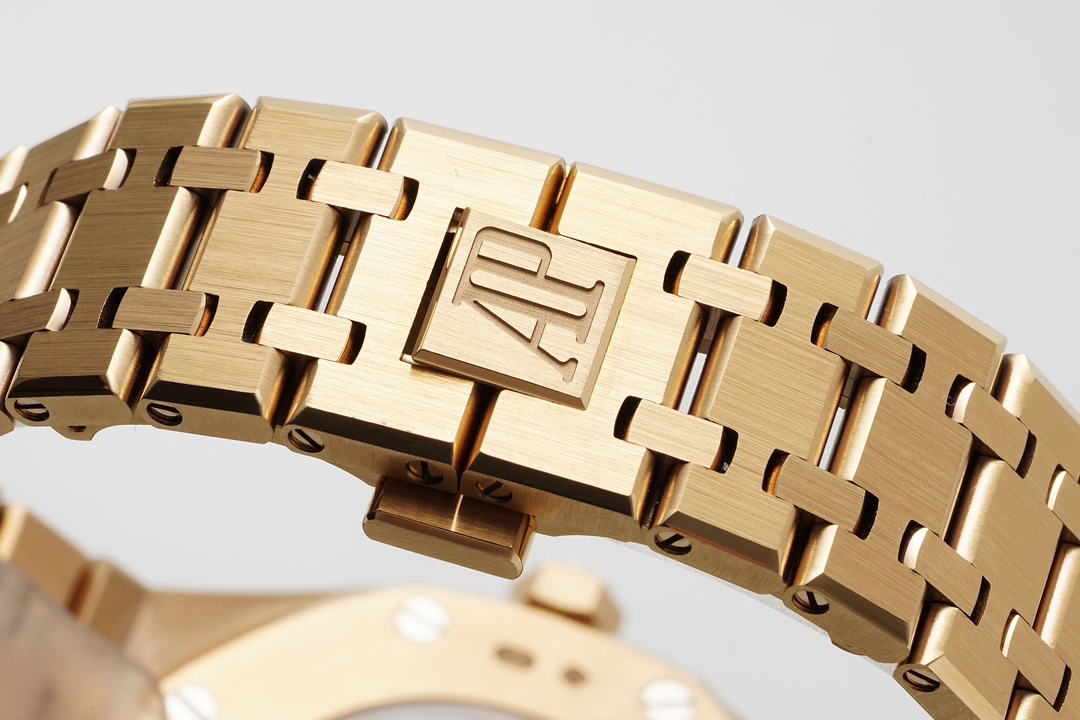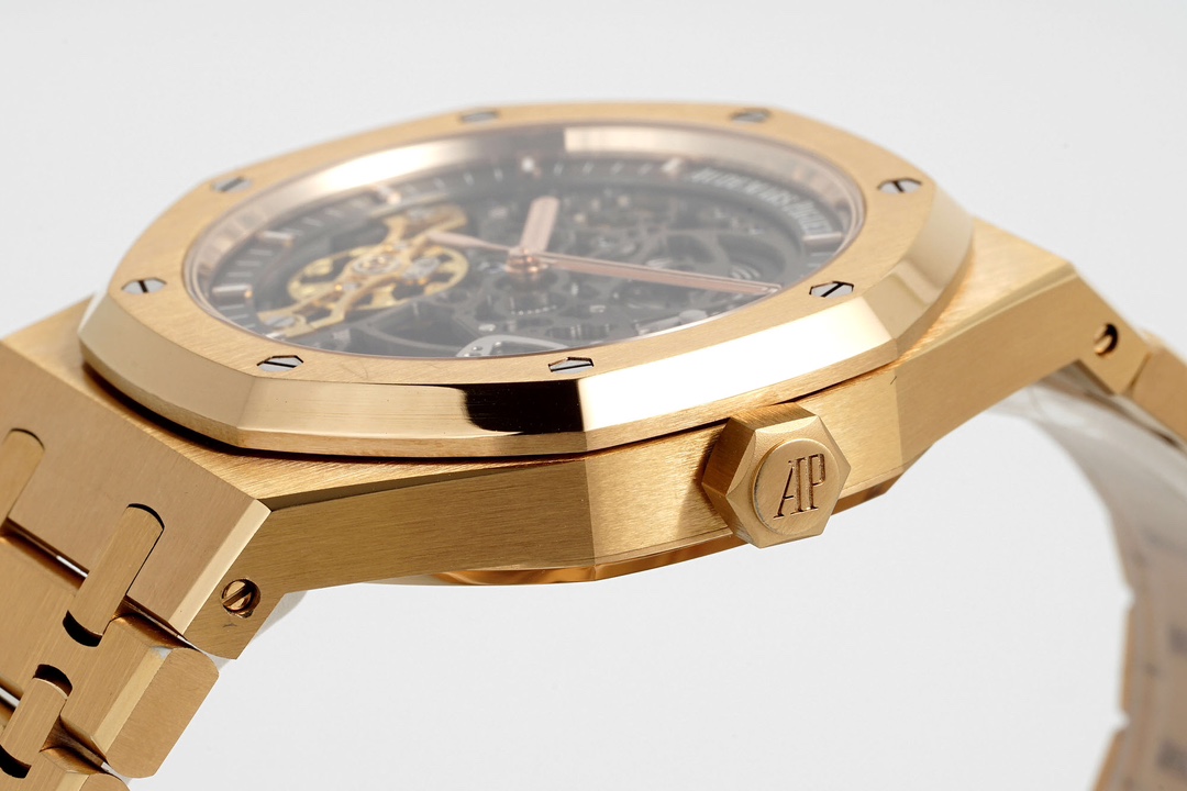 [Case] 41mm. The Royal Oak’s octagonal case exudes a bold, rugged character. Rose gold is a material particularly favored by Audemars Piguet; compared to the boldness of stainless steel, rose gold offers a touch of softness. When combined with the rugged Royal Oak, it creates a wonderful balance of strength and elegance, resulting in a stunning visual effect. It features anti-reflective sapphire crystal glass on both the front and back, a screw-down crown, and water resistance up to 50 meters.