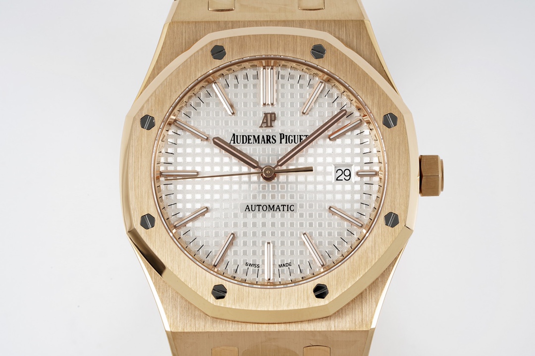 ZF’s Masterpiece—the “Rose Gold” AP Royal Oak 15400OR (Featuring the Integrated CAL.3120 Movement). The case is crafted from Swiss 4N rose gold, boasting a pure hue that is rust-resistant and corrosion-resistant, and meets international and industry standards. It can be considered the only “Ultimate Edition” 15400OR currently available on the market. The monobloc case and octagonal bezel, with hexagonal screws slightly recessed into the case, rival the authenticity of the genuine article. The Tank-style bracelet offers the same snug fit and refined texture as the original, with smooth, flowing curves. The dial features a neatly arranged “TAPISSERIE” pattern, complemented by white gold luminous 3D hour markers and Royal Oak hands. (These details are even more stunning when seen in person.) The newly developed in-house CAL.3120 movement features a balance wheel positioned at the 7 o’clock mark, just like the genuine model, and a flat hairspring. The gears on the mainplate and the mainspring barrel are fully functional. The power reserve matches the original at 41 hours. The ZF 15400OR has undergone a comprehensive upgrade—it’s love at first sight, and you can own it at any age!