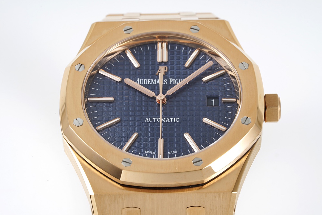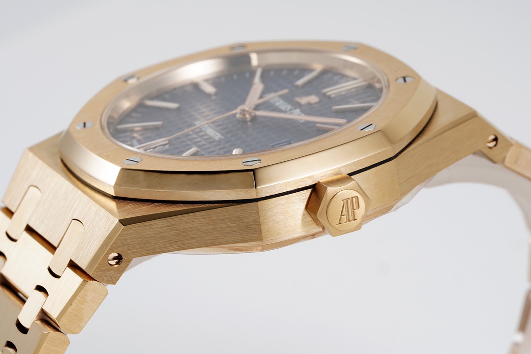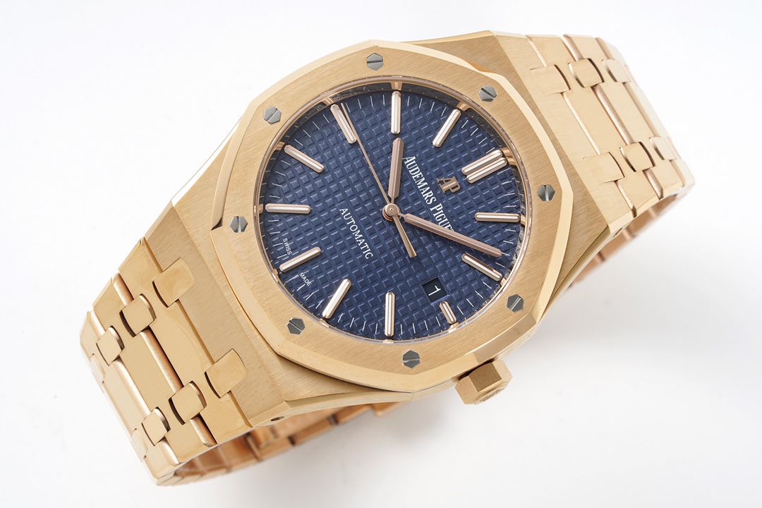ZF’s Masterpiece—the “Rose Gold” AP Royal Oak 15400OR (Featuring the Integrated CAL.3120 Movement). The case is crafted from Swiss 4N rose gold, boasting a pure hue that is rust-resistant and corrosion-resistant, and meets international and industry standards. It can be considered the only “Ultimate Edition” 15400OR currently available on the market. The monobloc case and octagonal bezel, with hexagonal screws slightly recessed into the case, rival the authenticity of the genuine article. The Tank-style bracelet offers the same snug fit and refined texture as the original, with smooth, flowing curves. The dial features a neatly arranged “TAPISSERIE” pattern, complemented by white gold luminous 3D hour markers and Royal Oak hands. (These details are even more stunning when seen in person.) The newly developed in-house CAL.3120 movement features a balance wheel positioned at the 7 o’clock mark, just like the genuine model, and a flat hairspring. The gears on the mainplate and the mainspring barrel are fully functional. The power reserve matches the original at 41 hours. The ZF 15400OR has undergone a comprehensive upgrade—it’s love at first sight, and you can own it at any age!